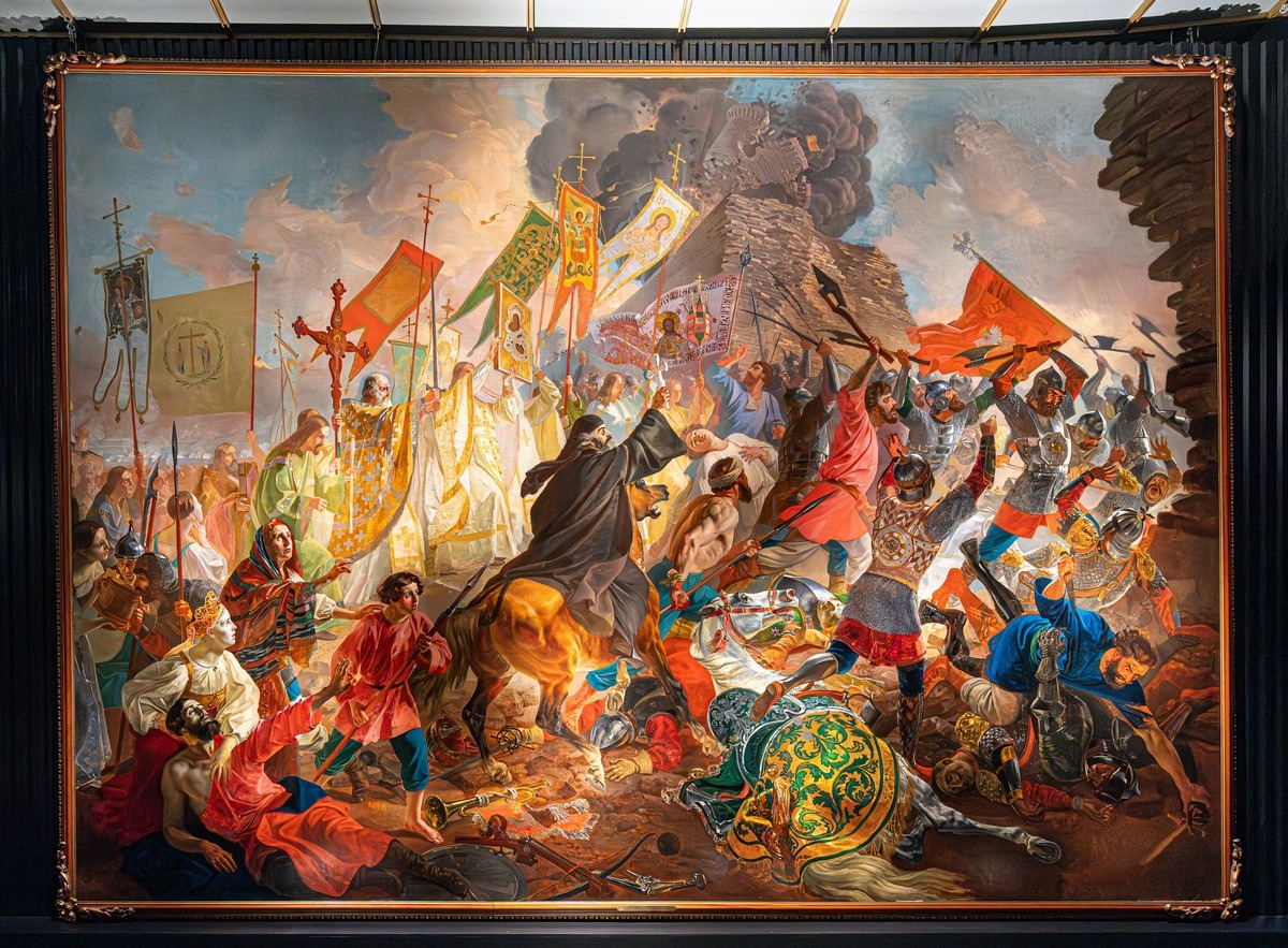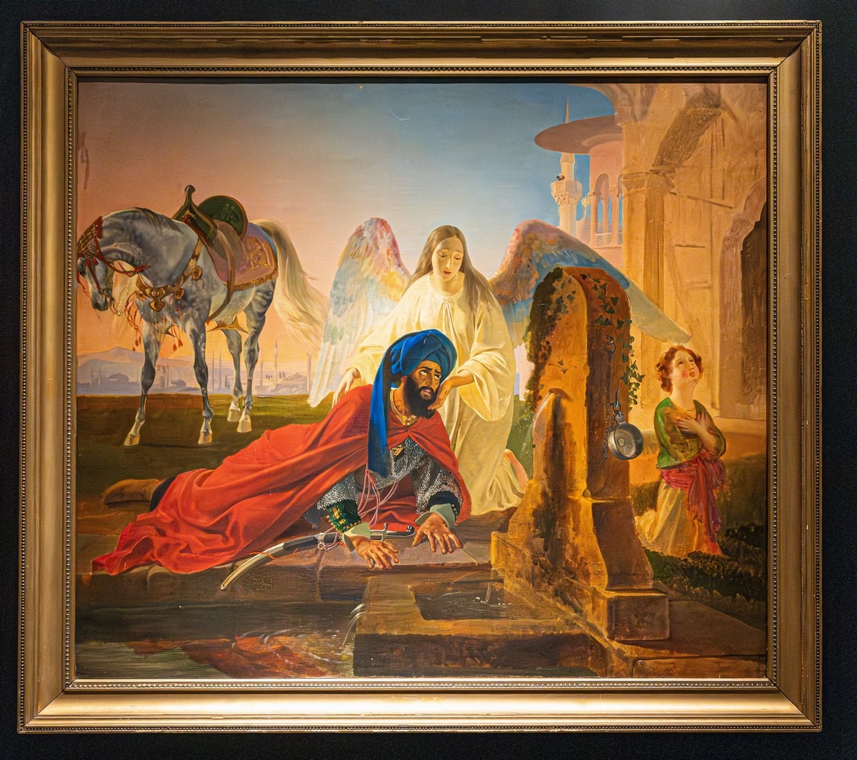 Интересная история от нашего «экскурсовода-профессора». Однажды из Великобритании пришёл запрос на фотографию этой картины, причём хорошего качества. Причём только морды лошади! Как оказалось, на картине изображена какая-то очень редкая и весьма почитаемая порода арабских скакунов. И Брюллов изобразил этого коня максимально живо и естественно, лучше всех остальных. Такие истории тоже случаются, вот как бывает.