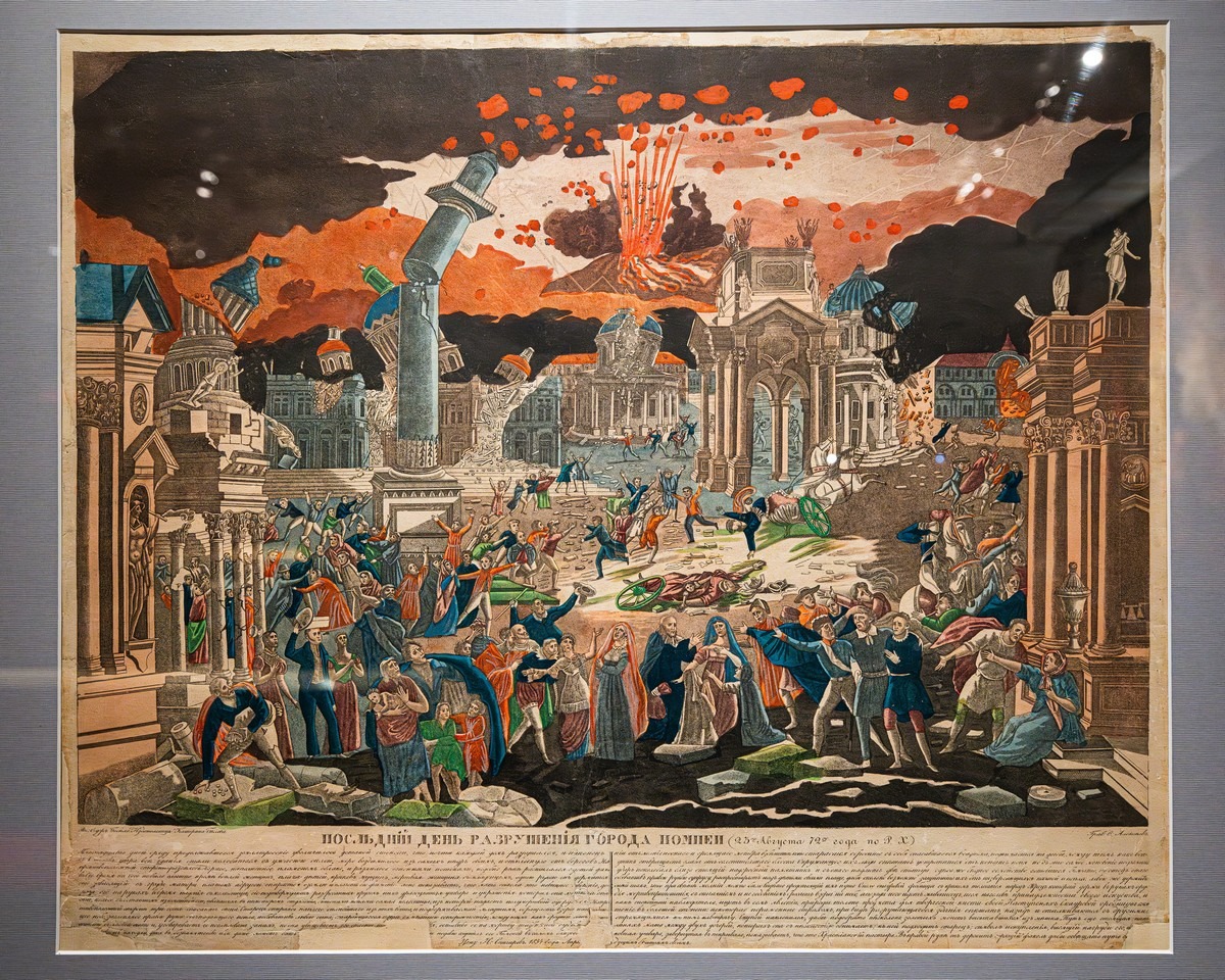 Что ещё интересного — по мотивам этой великой картины стали массово выпускать лубочные поделки по той же теме. Вот, например, «Последний день разрушения города Помпеи»: