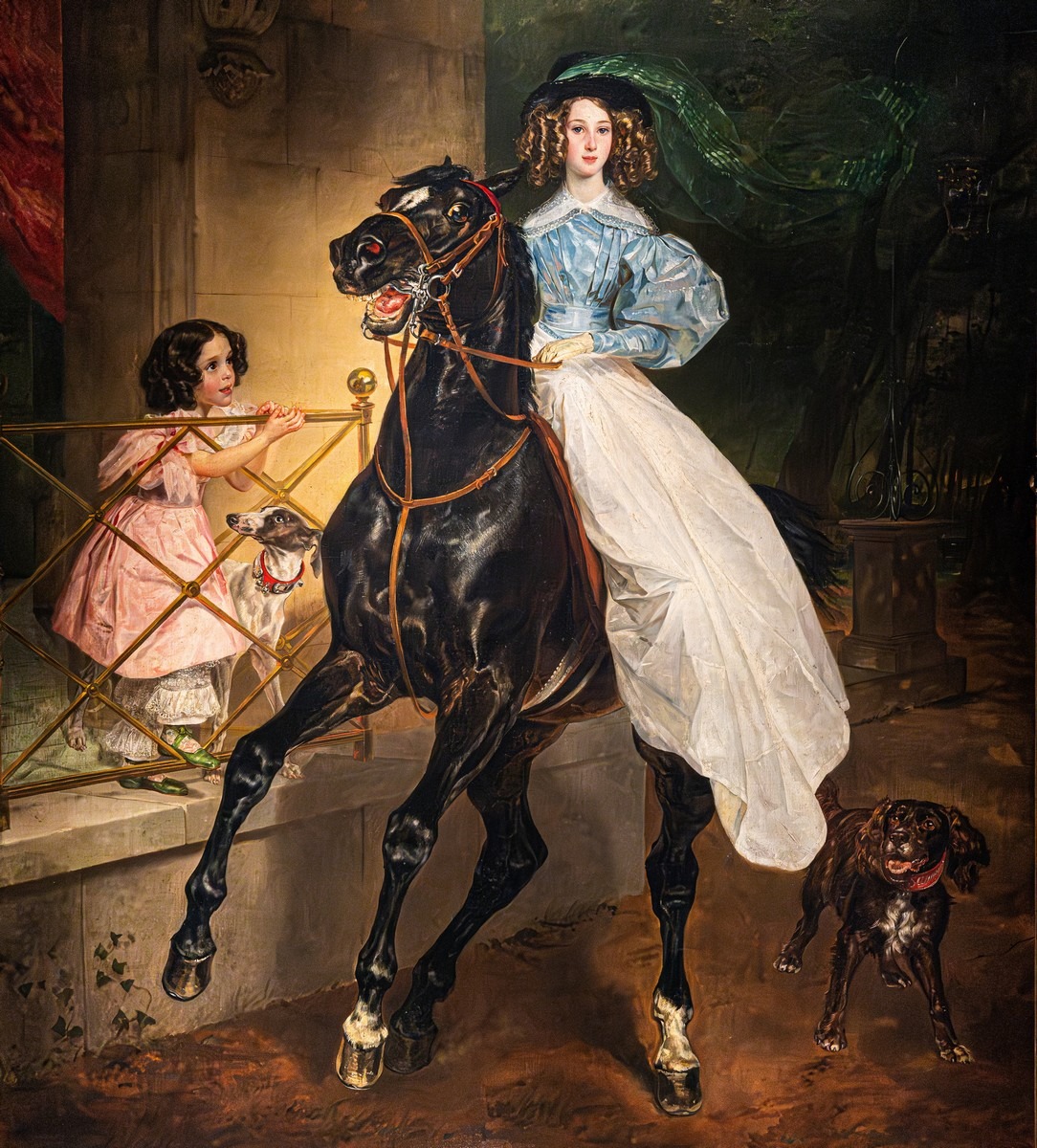 «Всадница» — ещё один известный шедевр художника. Вот мне только непонятно, а почему все персонажи (включая лошадь и собак) — они все «живые», в движении, а всадница осталась неподвижной, как мраморная статуя? Как так и почему? Ну, кто же теперь ответит…