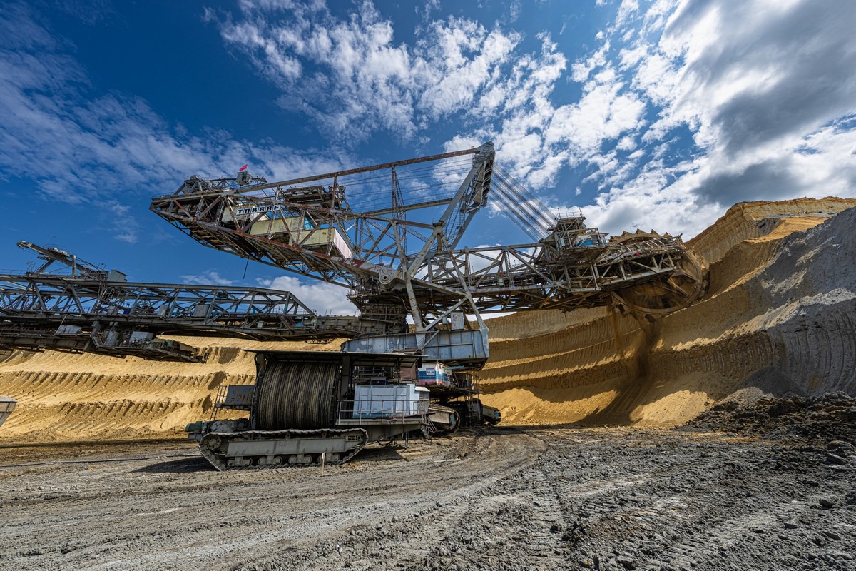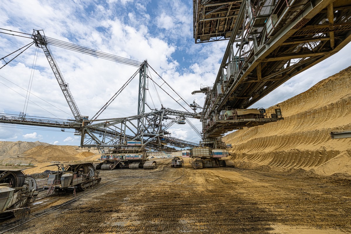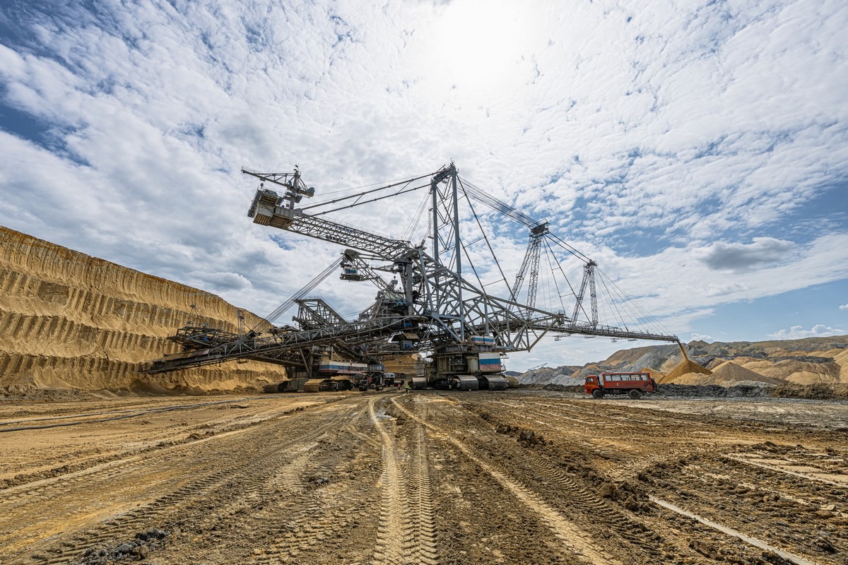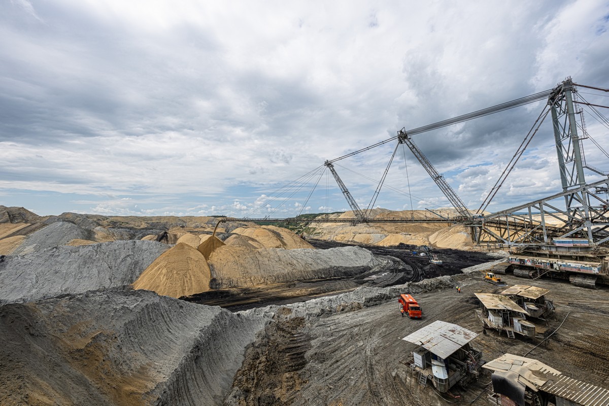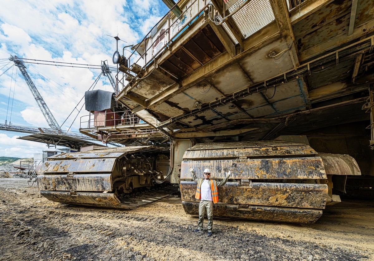 Но самое интересное здесь однозначно — циклопических размеров шагающий экскаватор, который снимает пустую породу («вскрышу») и лентой транспортёра перекидывает её в отвал за линией добычи угля. Конструкция эта настолько огромна, что вблизи даже в широкоугольный объектив влезает только частично: