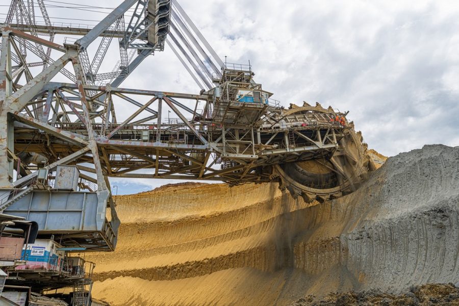 Если говорить техническими терминами, то этот механизм называется «роторный вскрышной комплекс» и состоит из трёх разных машин, связанных между собой технологически: роторный экскаватор + перегружатель + отвалообразователь. Экскаватор (машина-1) копает породу и на ленте транспортёра перемещает её на перегружатель (машина-2), который является этаким связующим звеном с отвалообразователем (машина-3), который, в свою очередь, укладывает горную массу в отвалы. Перегружатель является необходимым переходником, поскольку экскаватор по мере выработки породы постепенно движется вдоль карьера — и чтобы за ним сразу не тянуть всё остальное хозяйство, был придуман вот такой «трёхколенный шарнир».