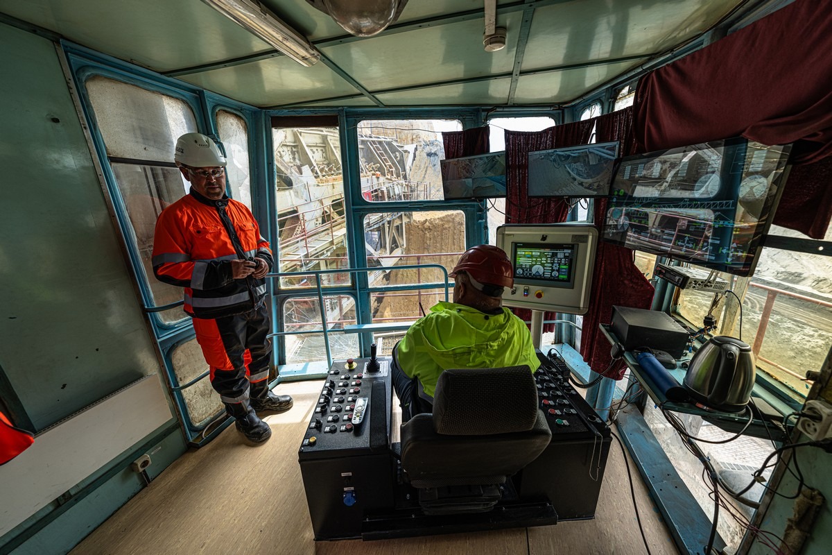 Ну, пора и погулять по этой гигантской конструкции! Экскаватор управляется вот отсюда. Само собой, хоть машина и достаточно возрастная, но всё уже давно оцифровано и компьютеризировано: