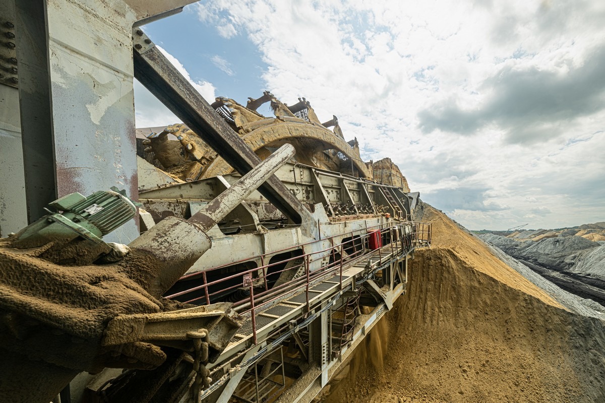 На роторном колесе вращаются 24 ковша, ёмкость каждого — 2 300 литров (на фотках чуть ниже можно будет оценить масштабы). Комплекс состоит из 5 конвейерных лент, если его вытянуть в одну линию, способен переместить породу на расстояние 420 м. Путь от забоя до отвала горная масса вскрышных пород преодолевает примерно за 2 минуты. Производительность этого гигантского комплекса — свыше 4 тыс. кубометров горной массы в час, а обслуживает его экипаж из 56 человек.