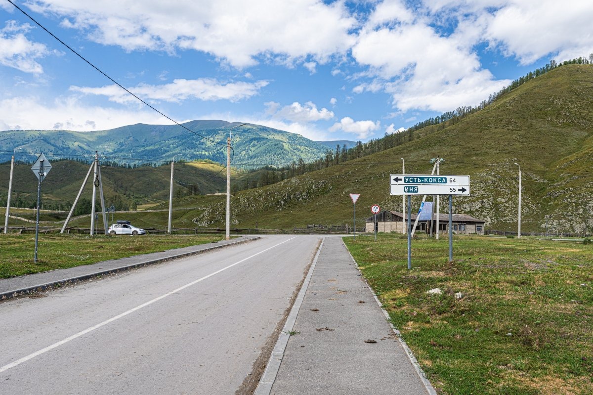 Не верьте знаку! Дороги направо до Ини нет вообще! Там только пешие, конные, велосипедные и мотомаршруты.