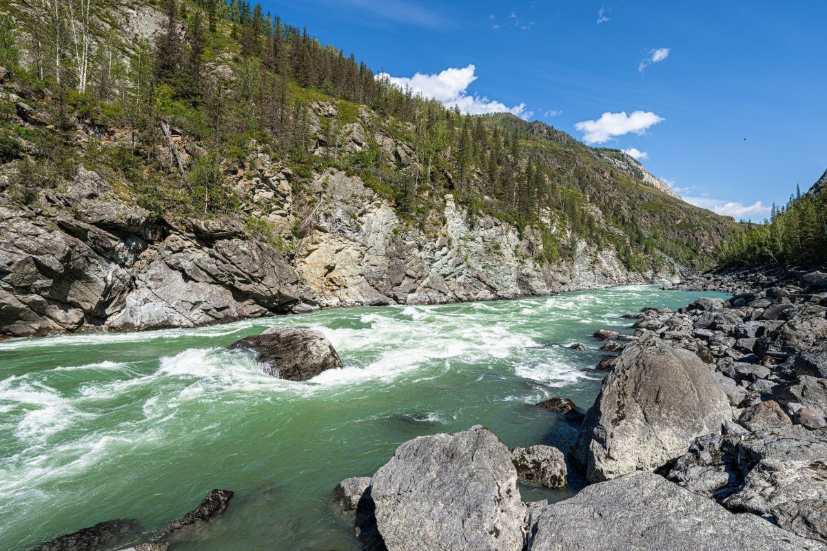 Итак, мы подошли к главному катунскому водному аттракциону – к Аккемскому прорыву (также известному, как «труба»). В давние времена Катунь проточила здесь примерно 12-километровое ущелье, где реку поджимает метров до 30 ширины, и весь водный поток рвётся вперёд с бешеной мощью.