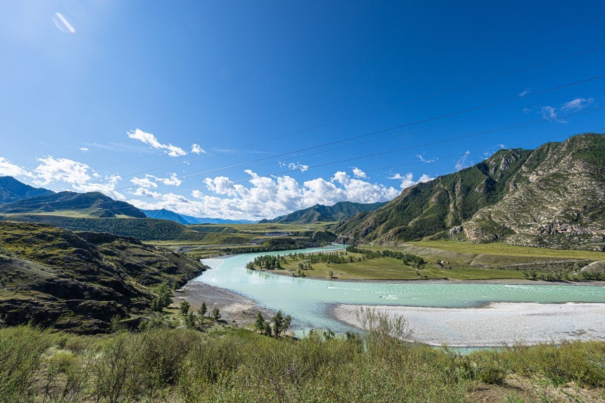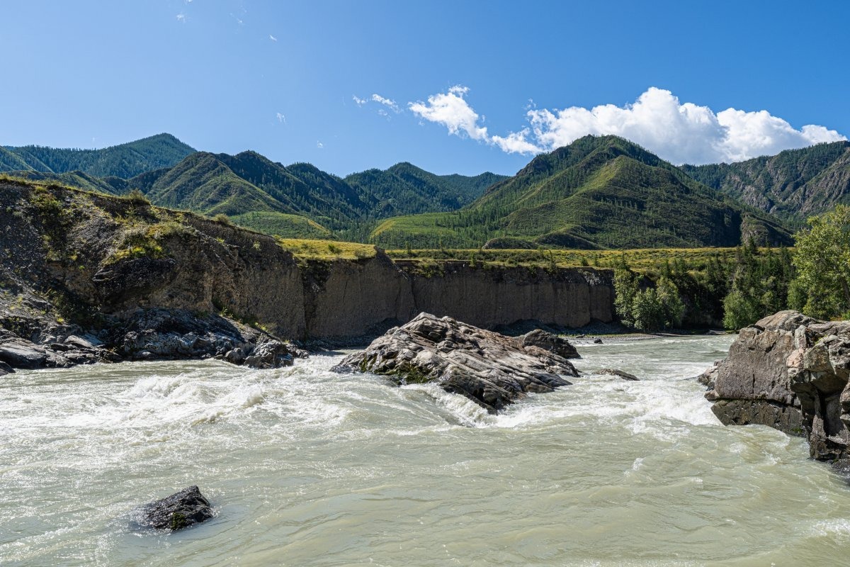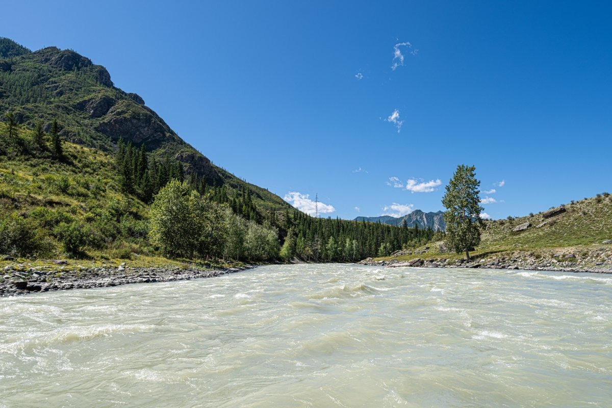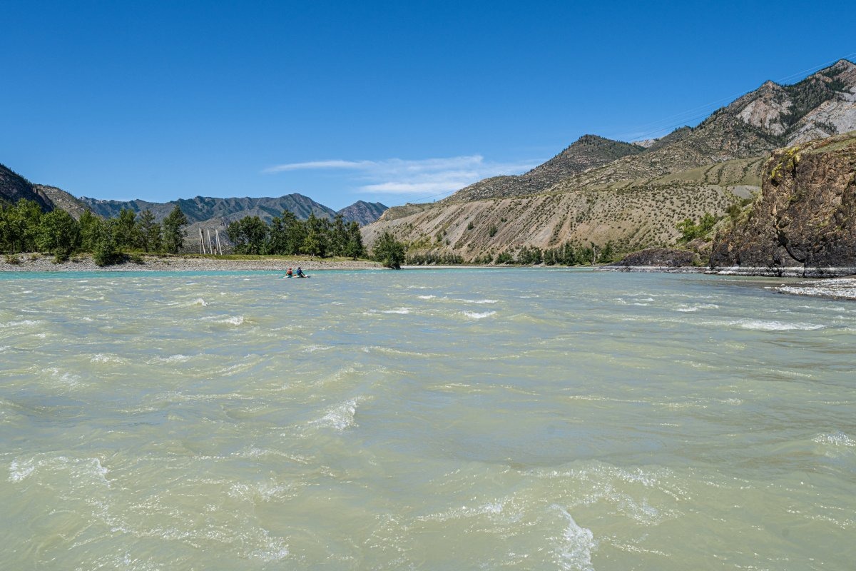 Вода Катуни – бирюзовая, вода Чуи – серого цвета. При слиянии получаются вот такие картинки:
