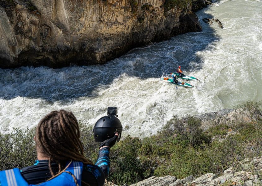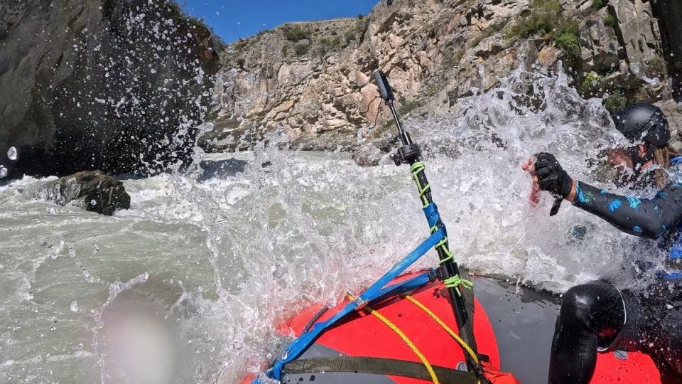 Можно, конечно, безопасненько пройти вдоль правого берега и сползти по сливу справа от камня, но тут я от наших гидов услышал фразу «это будет камнежопинг» и однозначно согласился идти по левой, более сильной, протоке.