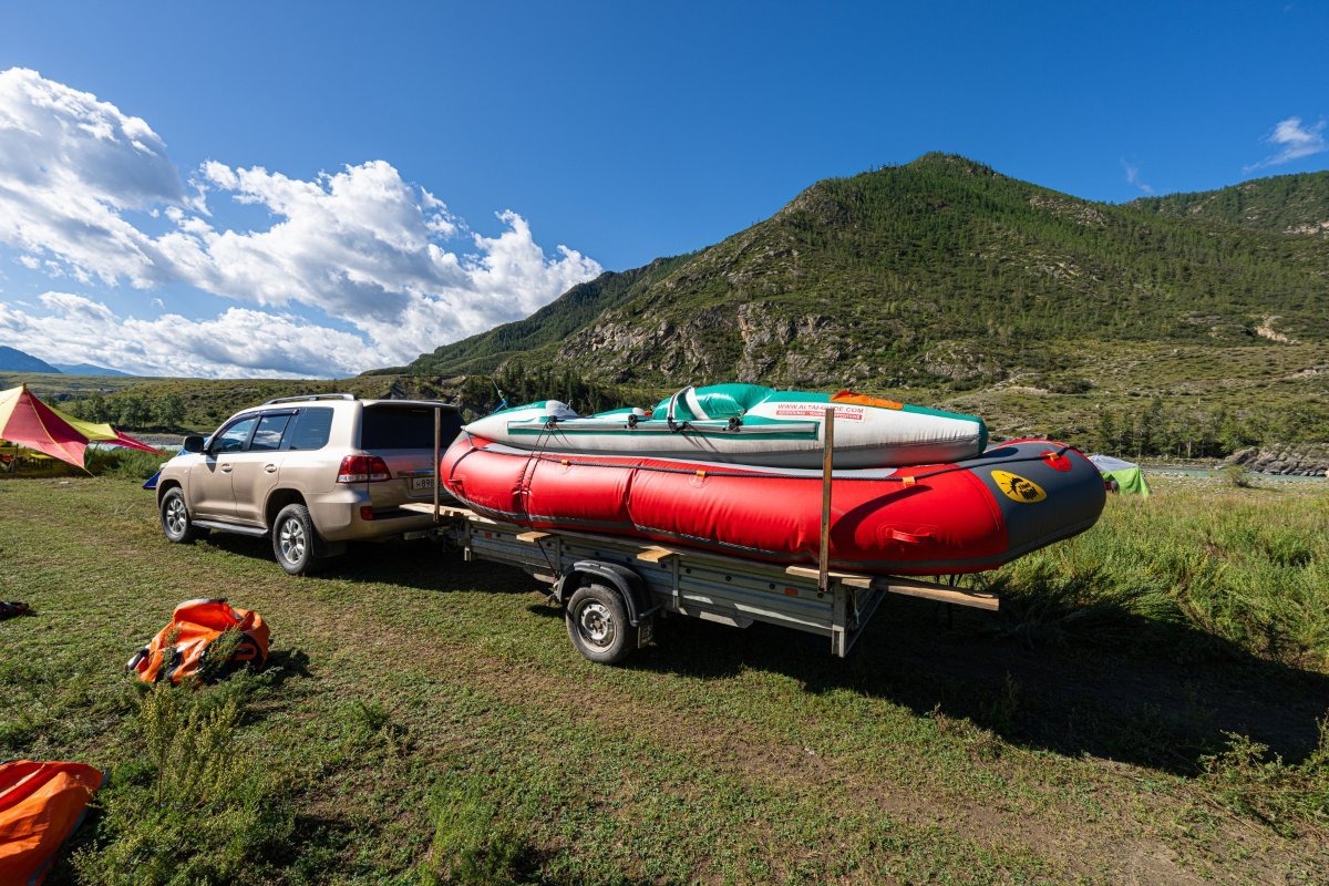 Грузим туристический рафт и катамаран-спасатель на прицеп и вперёд!