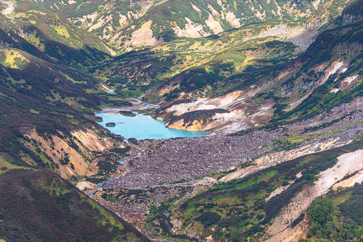 А вот это симпатичное озеро — результат ещё одного оползня, который перегородил речку, запрудил её, и в результате по причине неведомых подземных корреляций перестал работать гейзер Великан в Долине гейзеров, который находится, пардон, на 2,5 км юго-западней от оползня и озера. Вот такие природные связи у вроде бы разных геополитических географических событий.