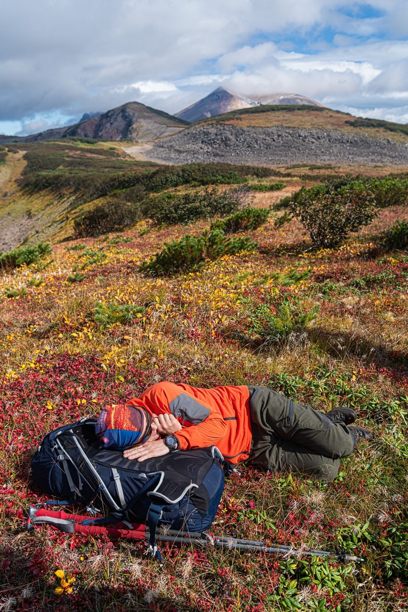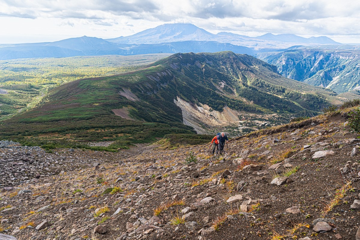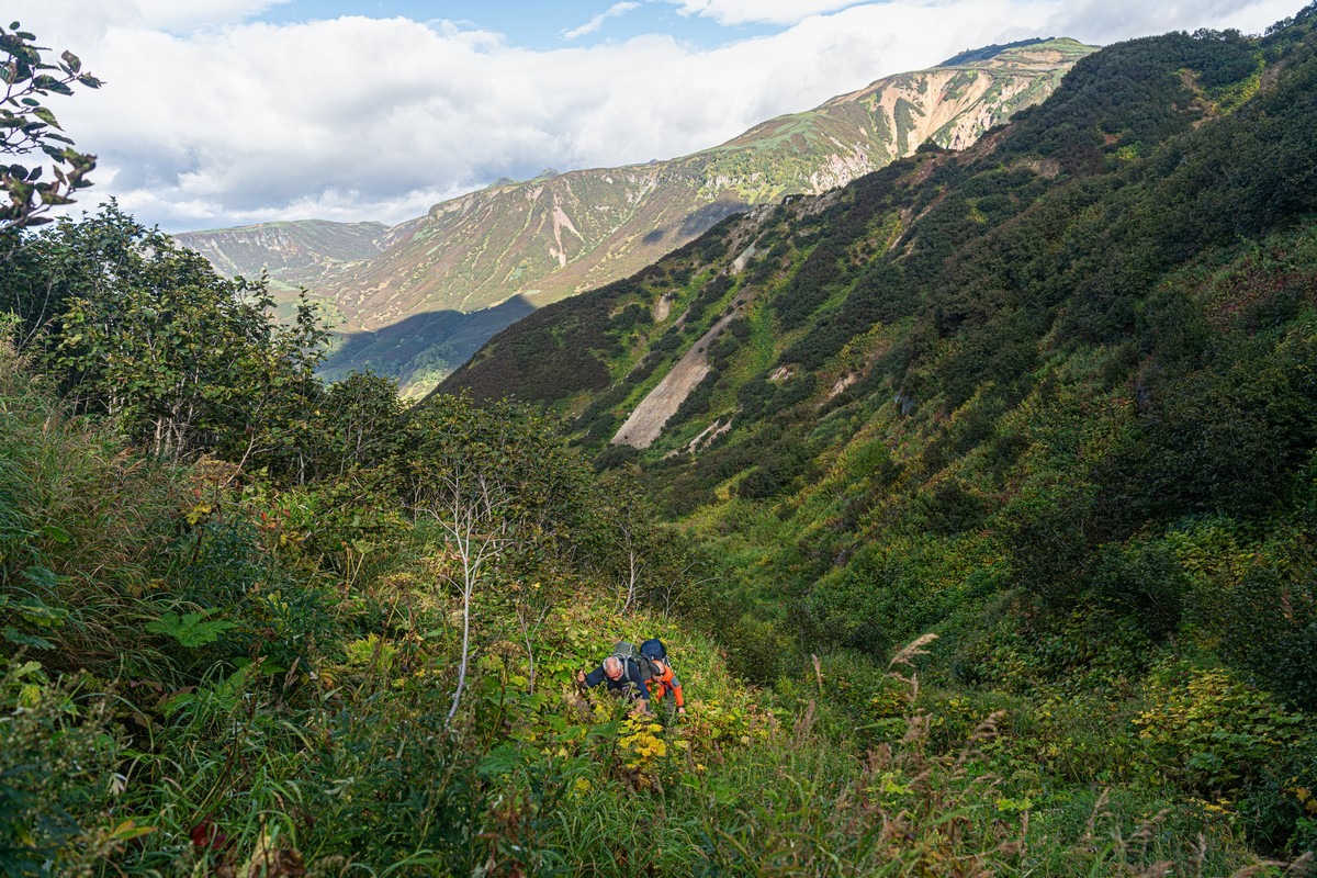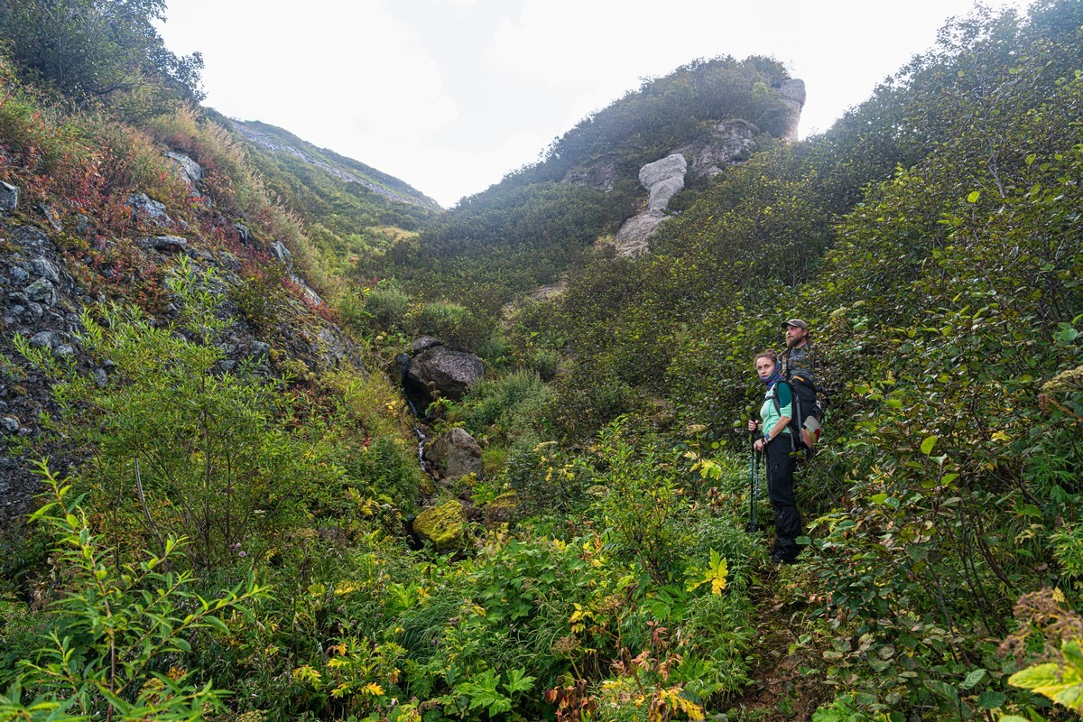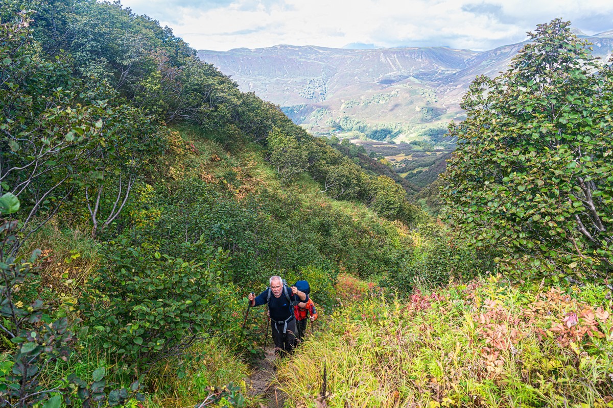 Громко распугивая потенциальных медведов в кустах (ни одного так и не встретили), мы вышли на плато. Даже неубиваемый Денис Камчатский приуныл от такого подъёма.