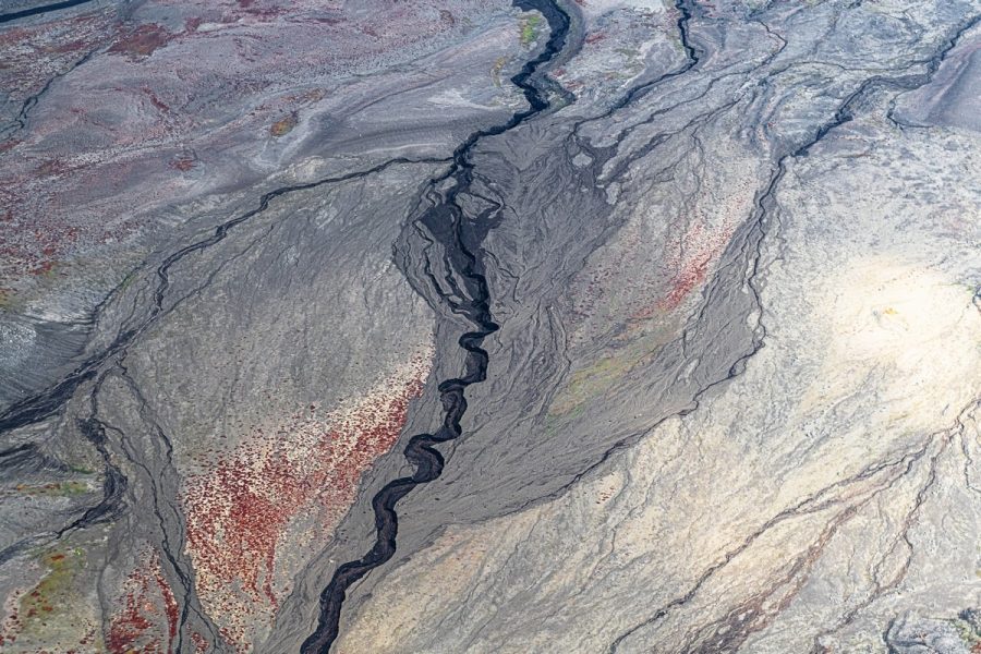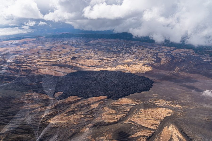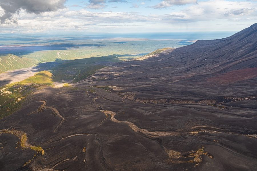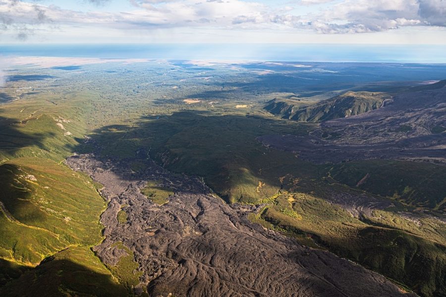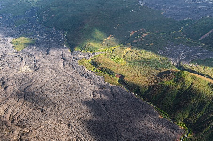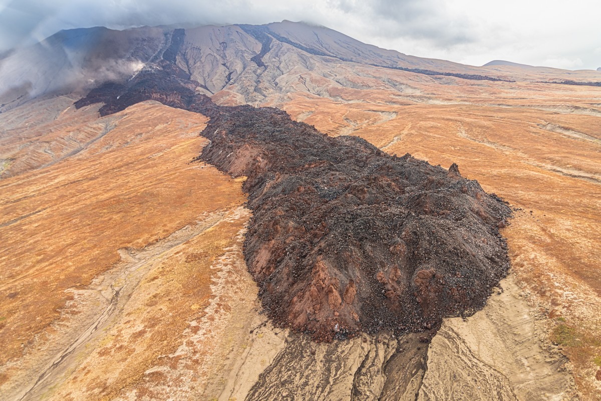 Свежие лавовые потоки — чёрными полосами на осеннем ландшафте.