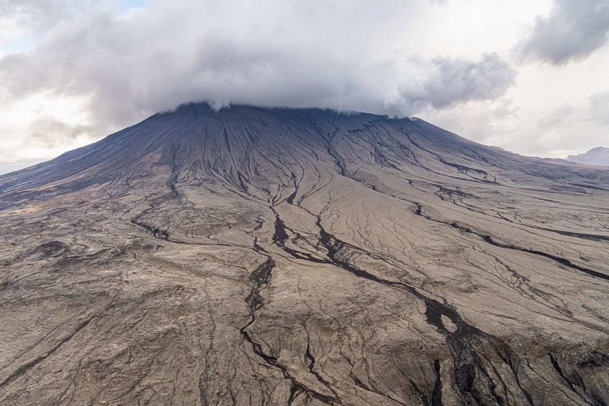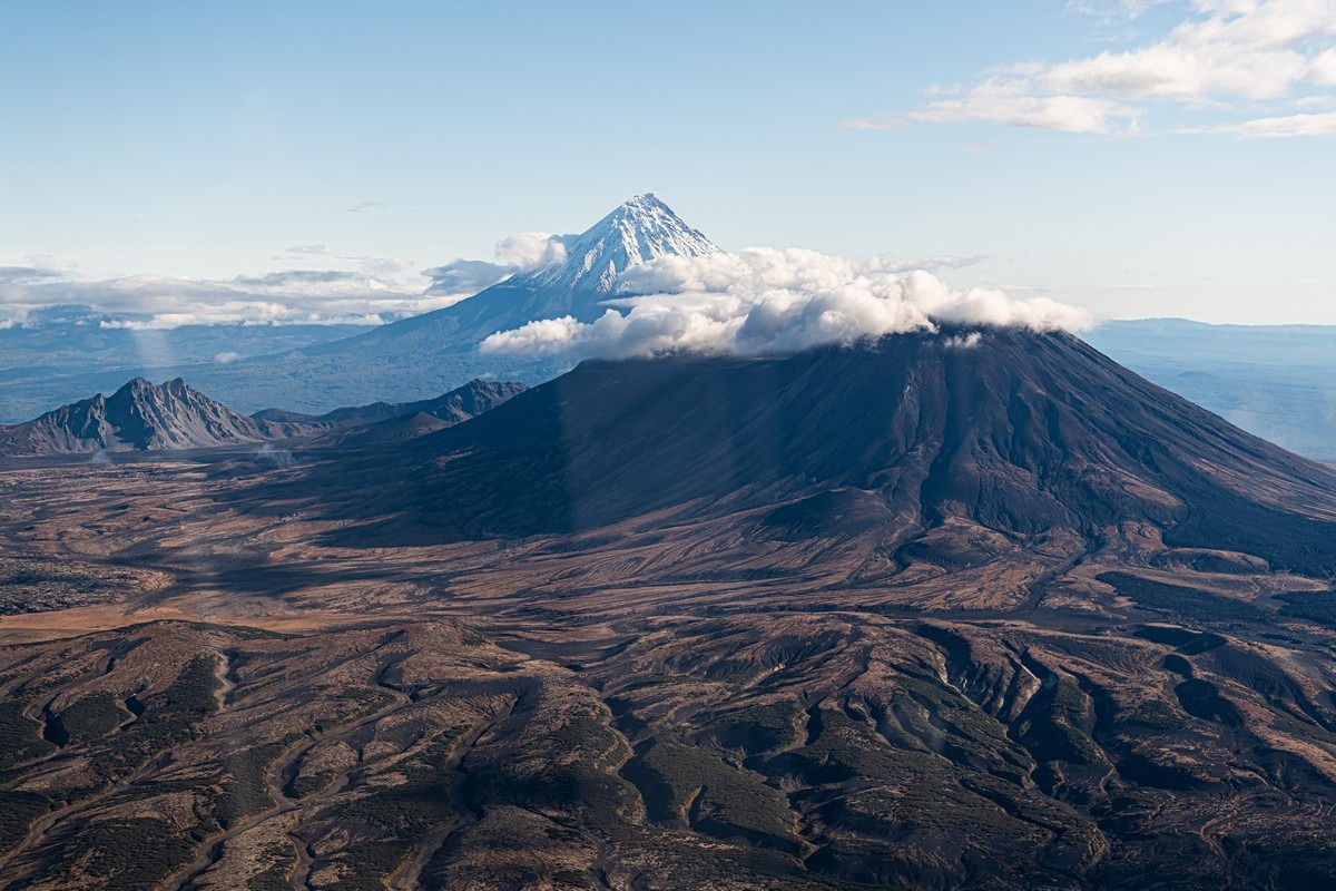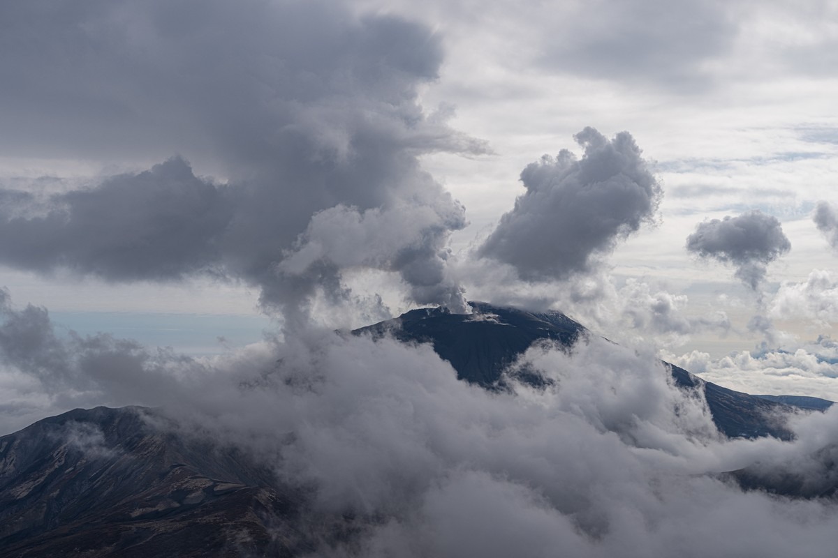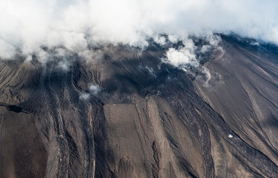 Но совсем близко подлететь не удалось — облака плотно облепили верхушку вулкана.