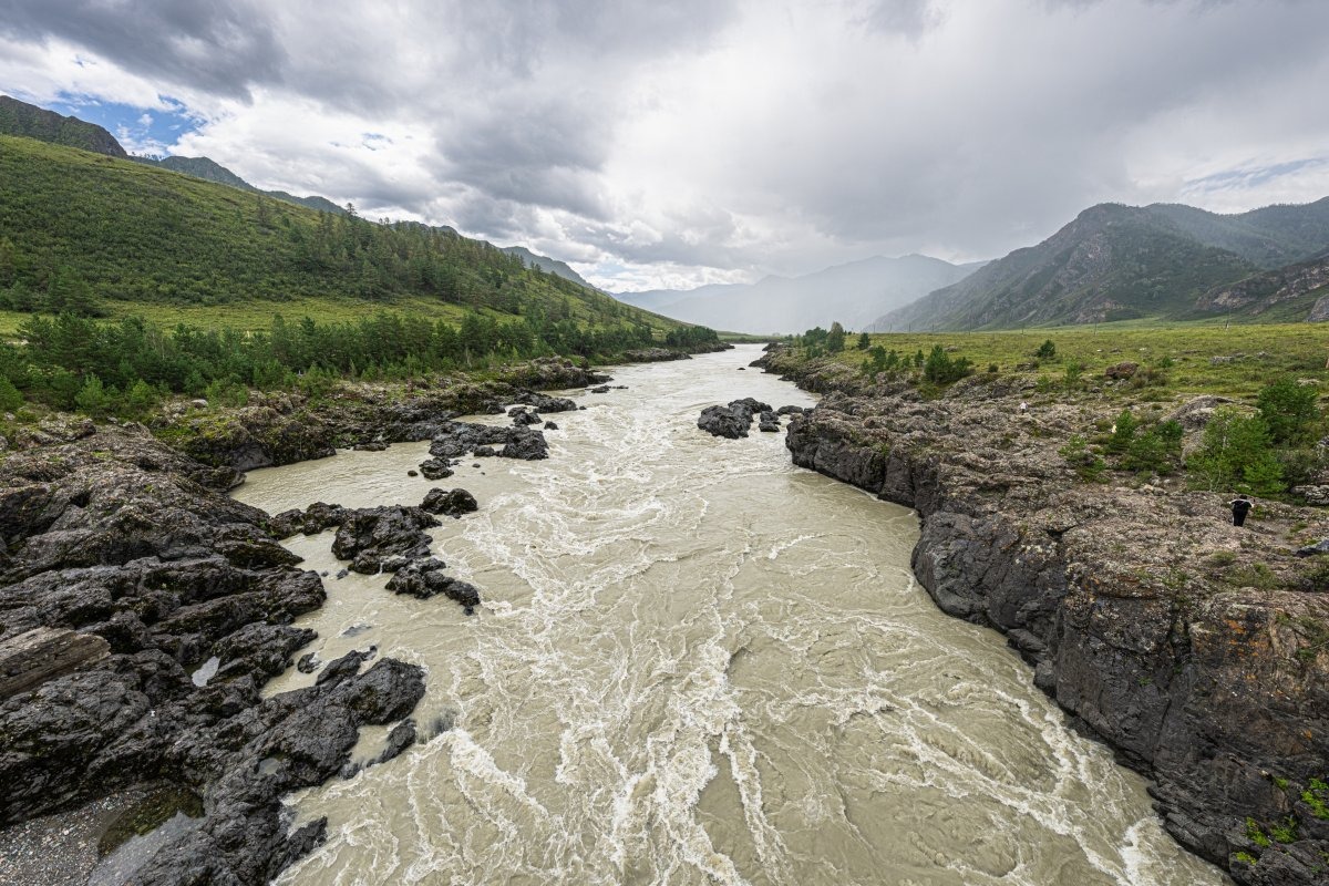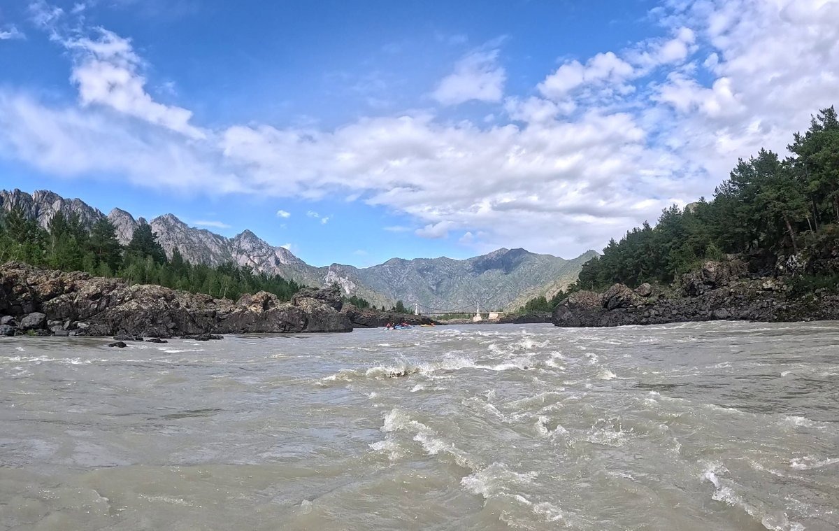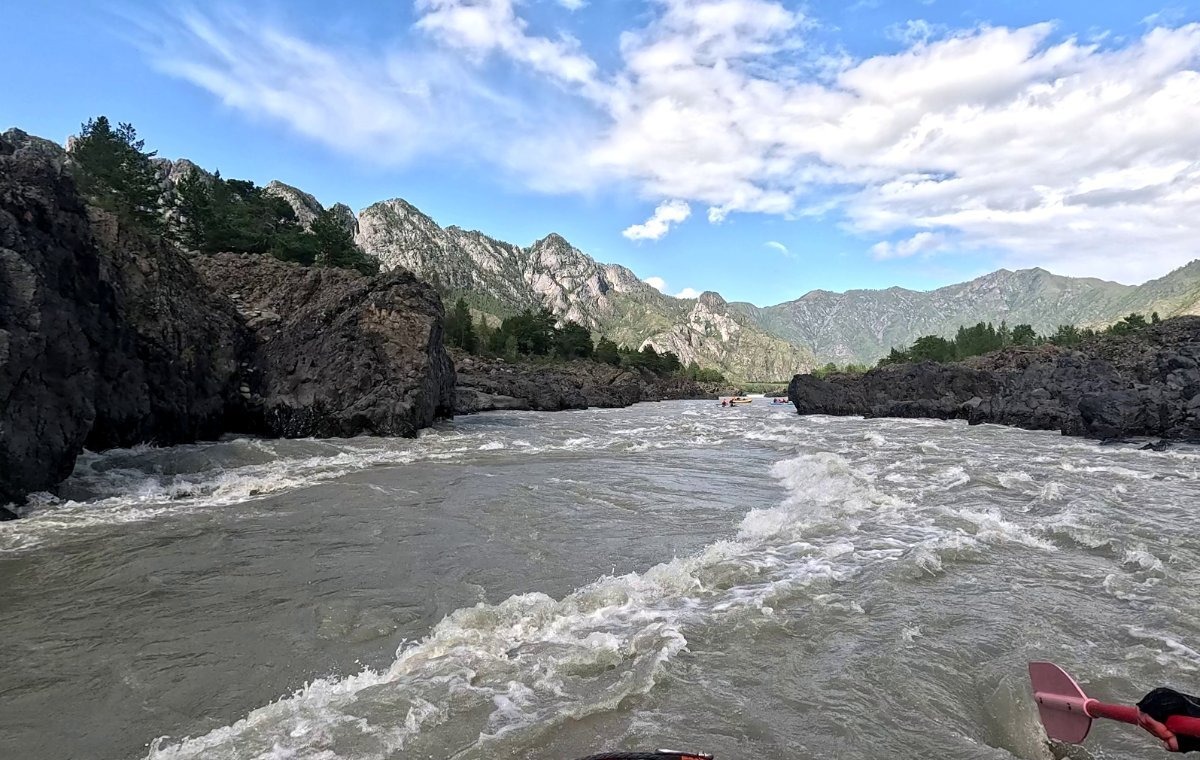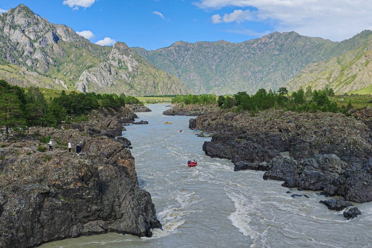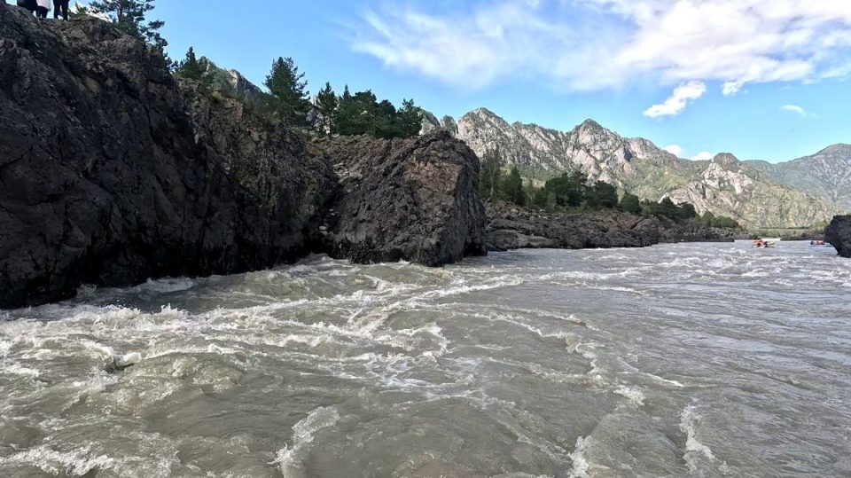 Однако у нас впереди были «Пни». Это место, где Катунь течёт в скальном ущелье, всю мощь реки поджимает до 20-30 метров ширины (про глубину воды в каньоне, и что там внизу творится – даже думать страшно), и вот это всё выглядит так: