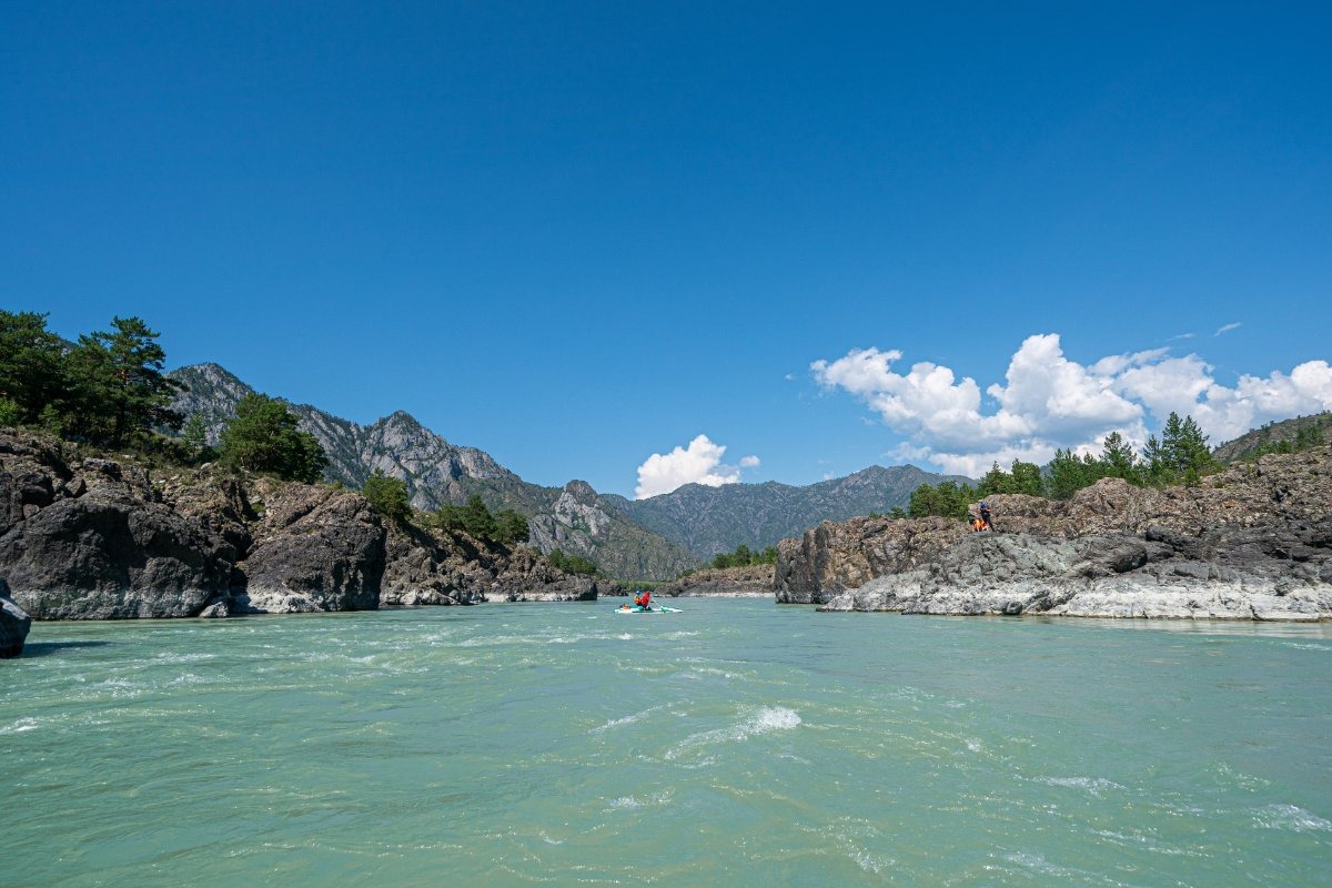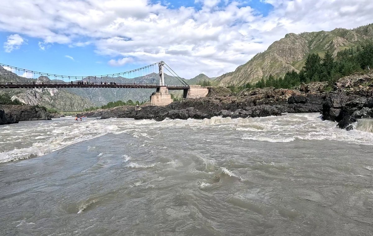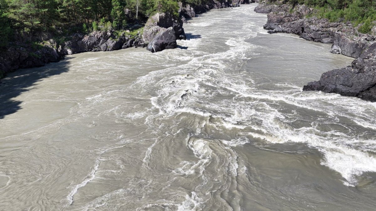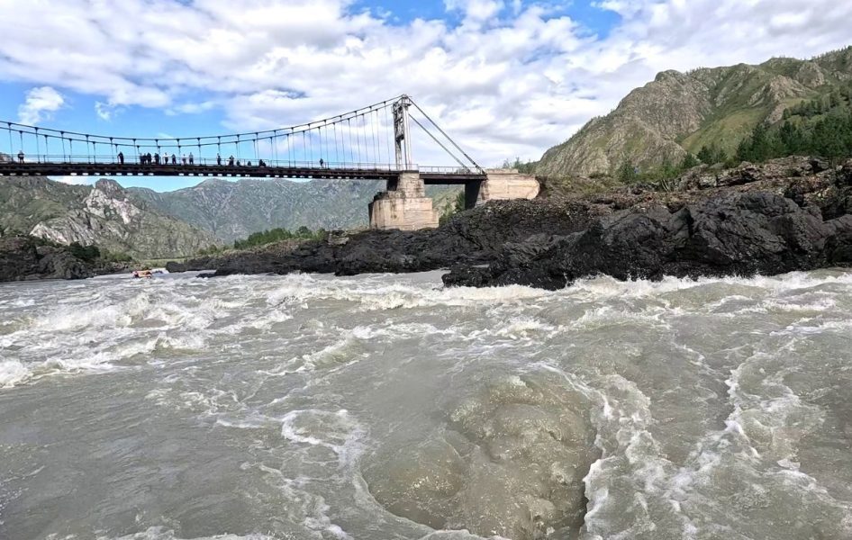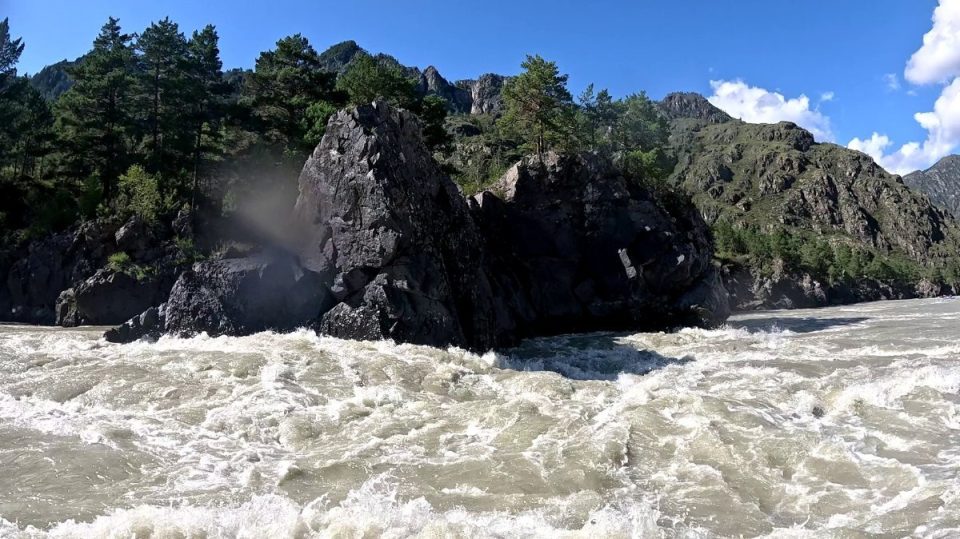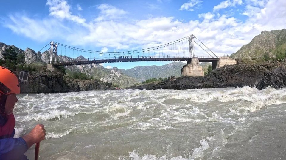 Однако у нас впереди были «Пни». Это место, где Катунь течёт в скальном ущелье, всю мощь реки поджимает до 20-30 метров ширины (про глубину воды в каньоне, и что там внизу творится – даже думать страшно), и вот это всё выглядит так: