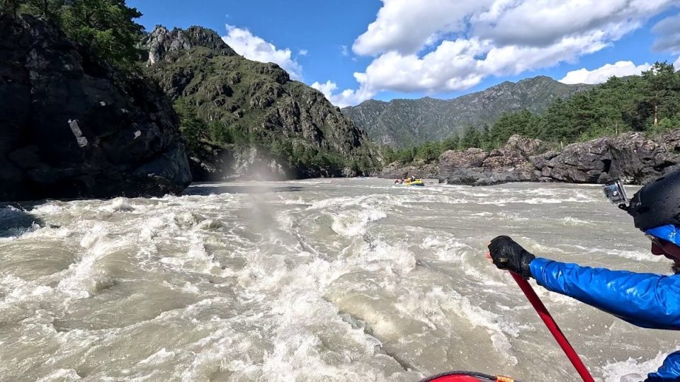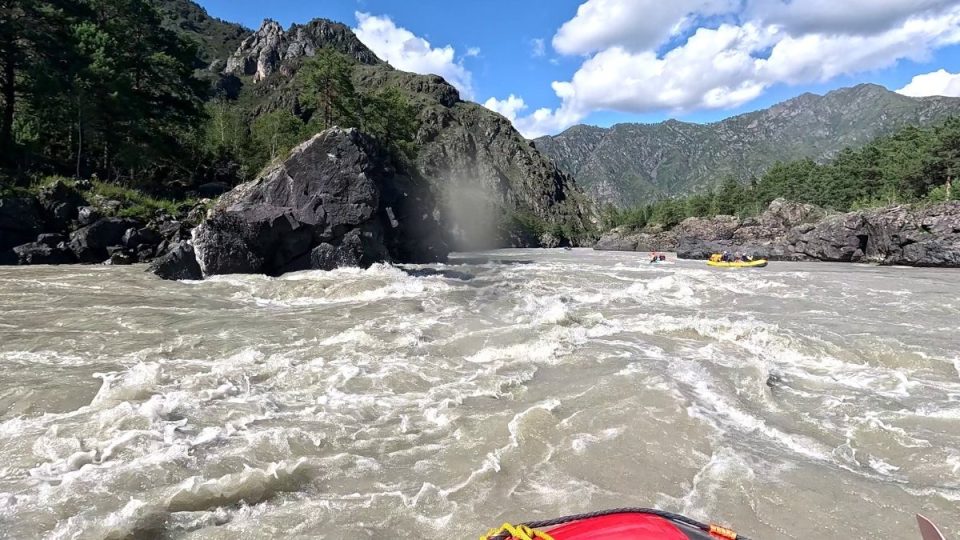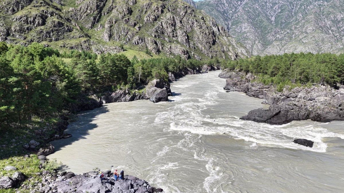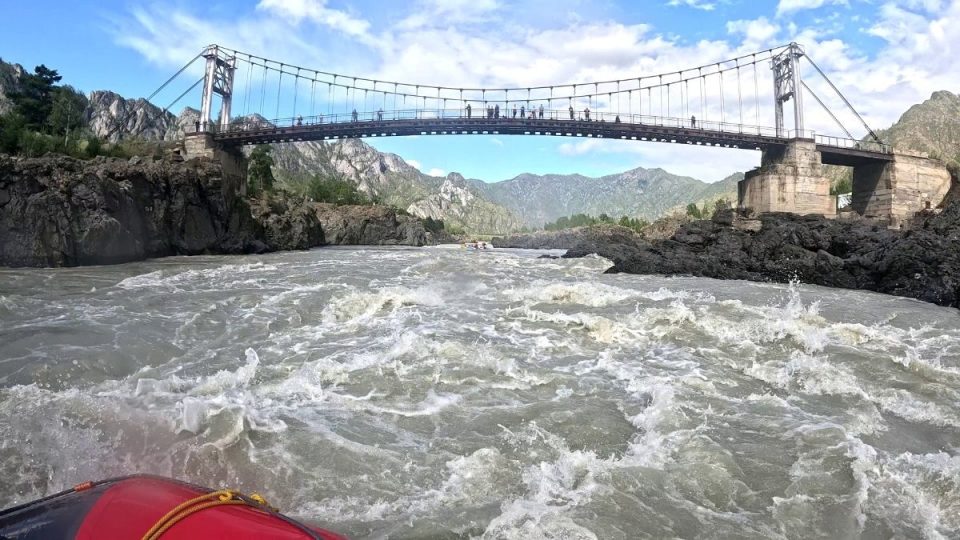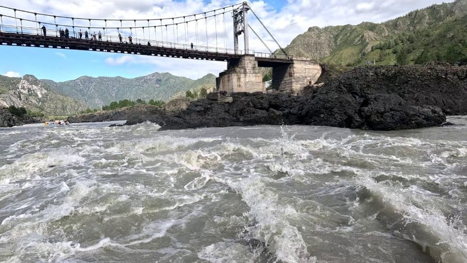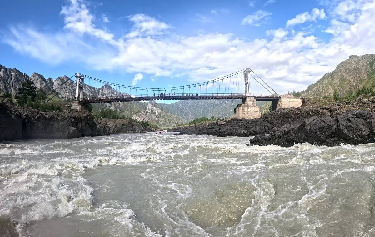 Однако у нас впереди были «Пни». Это место, где Катунь течёт в скальном ущелье, всю мощь реки поджимает до 20-30 метров ширины (про глубину воды в каньоне, и что там внизу творится – даже думать страшно), и вот это всё выглядит так: