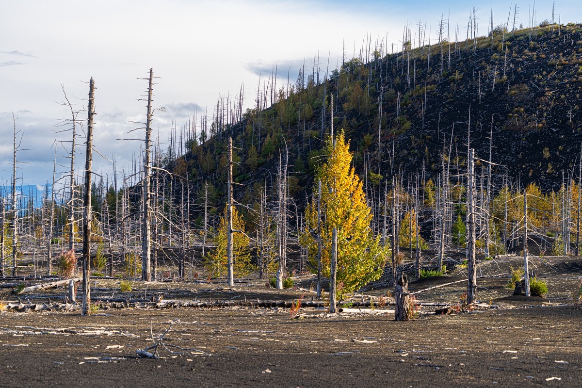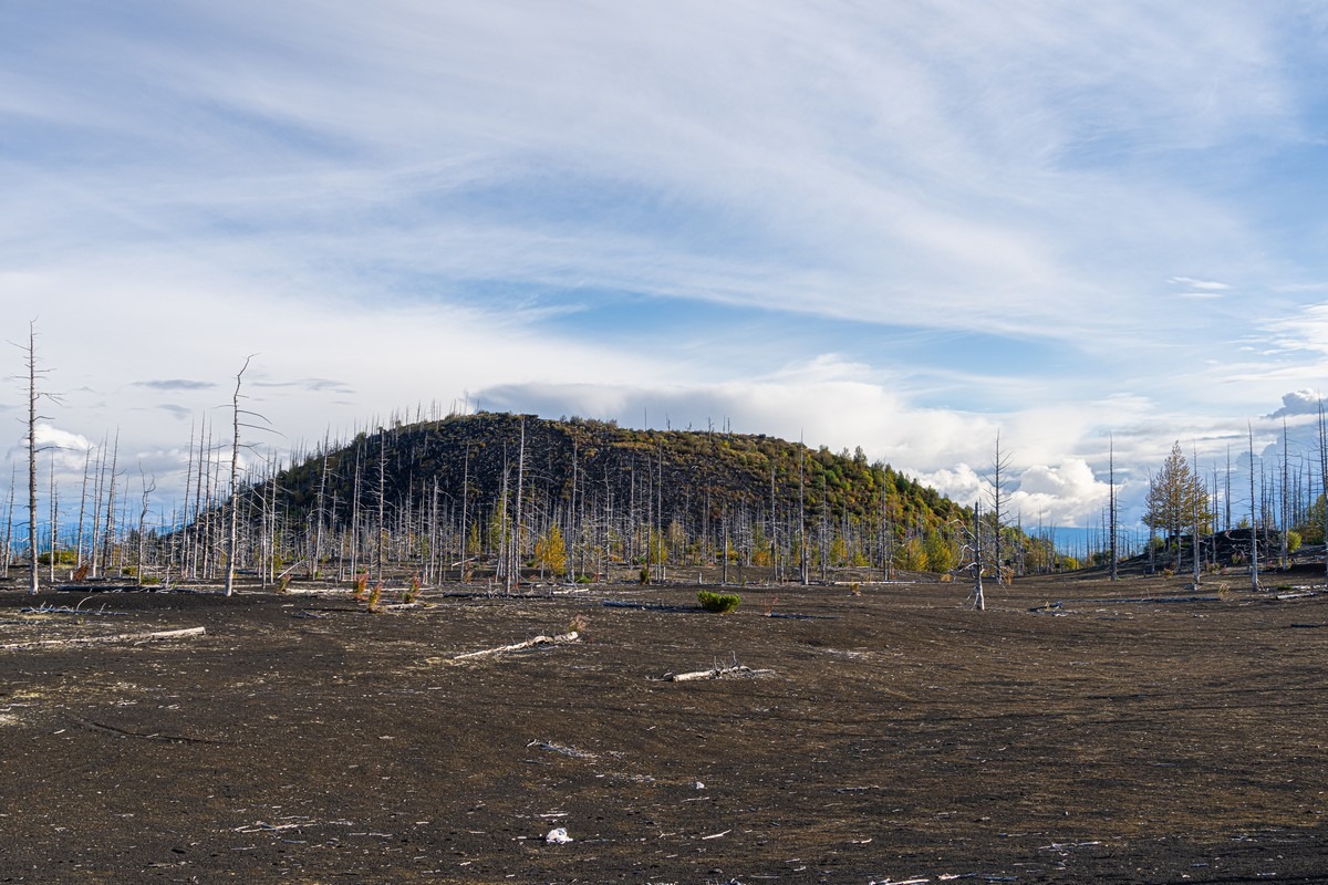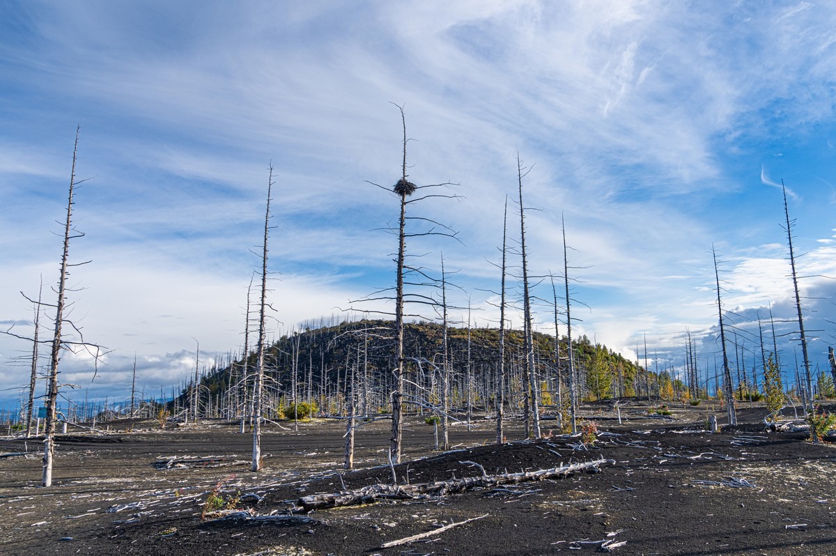 Ещё одно любопытное место у Толбачика — Мёртвый лес. Довольно значительные пространства, где лес был уничтожен извержением 1975-1976 годов. Некоторые ёлки засыпало только снаружи, ветки сдержали «шлаковый дождь», вокруг деревьев образовались пустоты. Потом ветки постепенно сгнивали, полости засыпало шлаком, а наверху в результате появлялись вот такие воронки: