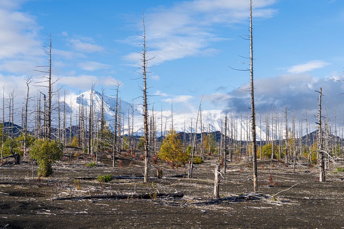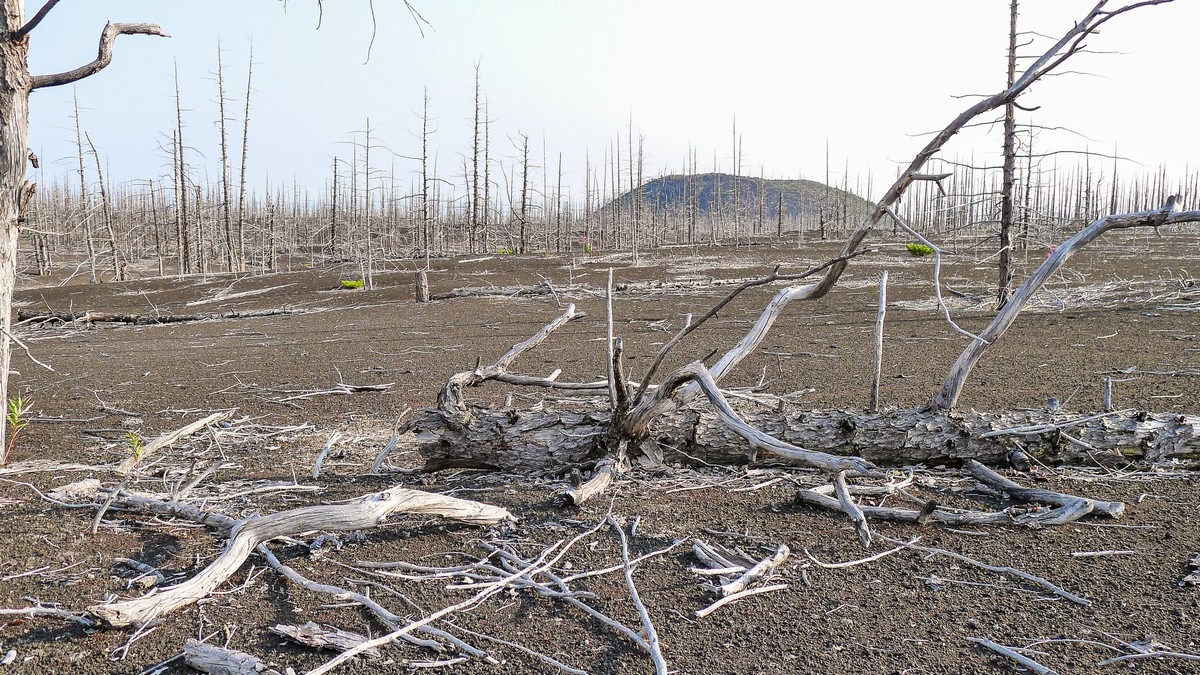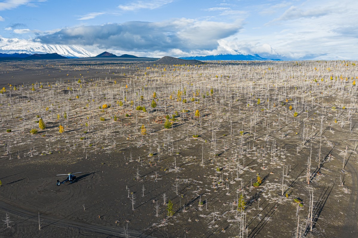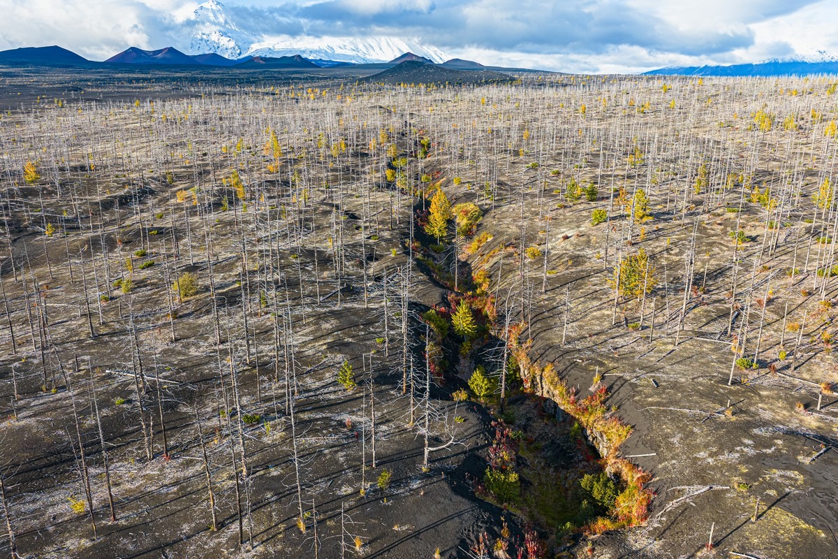 Ещё одно любопытное место у Толбачика — Мёртвый лес. Довольно значительные пространства, где лес был уничтожен извержением 1975-1976 годов. Некоторые ёлки засыпало только снаружи, ветки сдержали «шлаковый дождь», вокруг деревьев образовались пустоты. Потом ветки постепенно сгнивали, полости засыпало шлаком, а наверху в результате появлялись вот такие воронки: