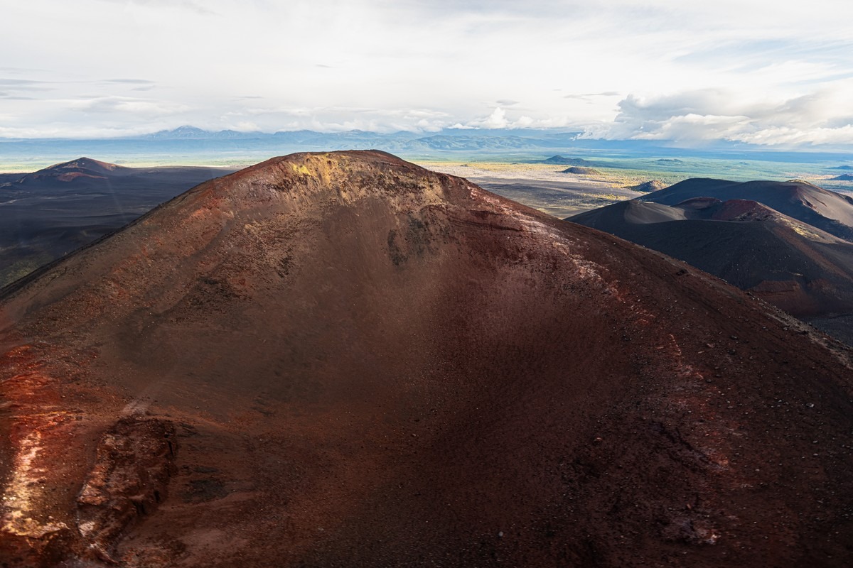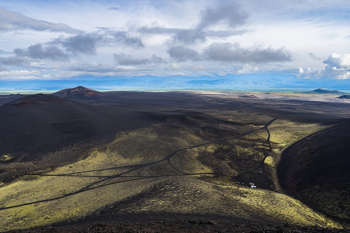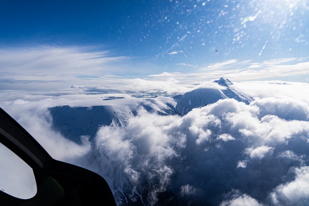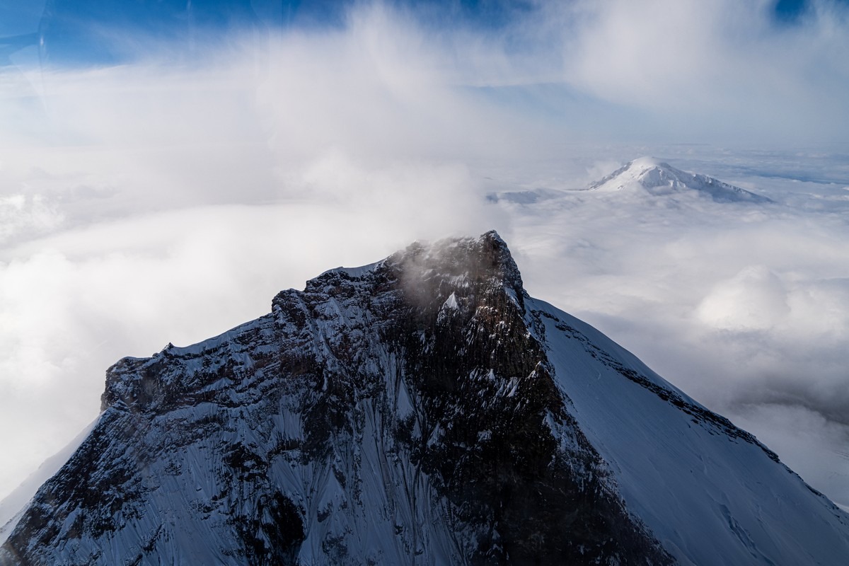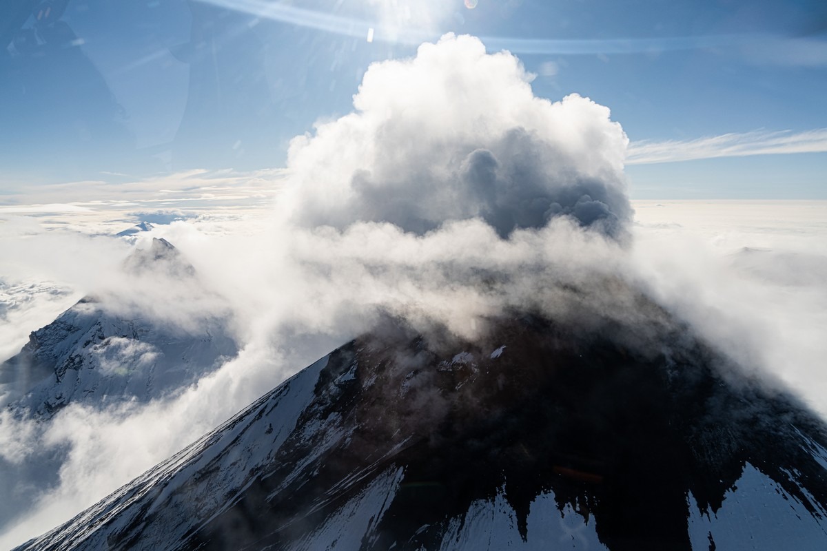 Погоде деваться некуда — когда-то она будет улучшаться. Каждый новый день нашего путешествия развивался именно по такому сценарию. Но сейчас нам показывают однозначно не самые созерцательные картинки. Пролетаем другим близлежащим вулканом Ключевской группы, Толбачиком.