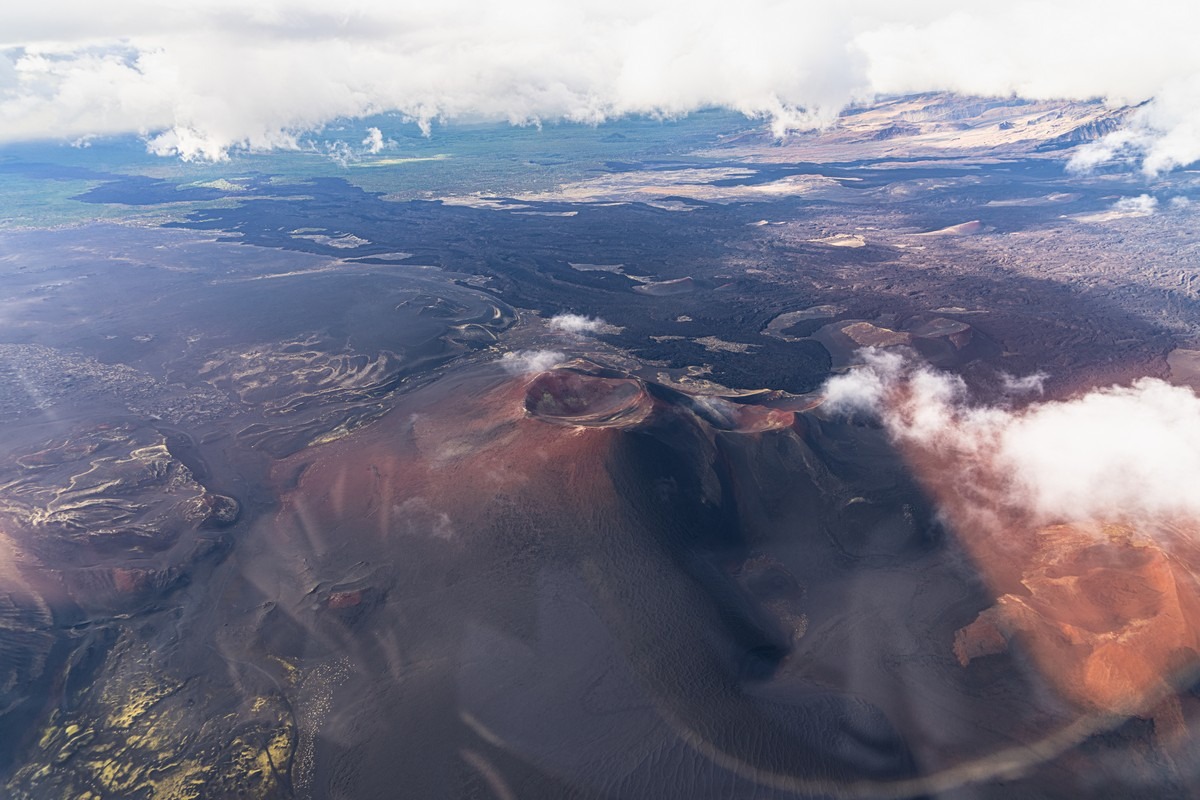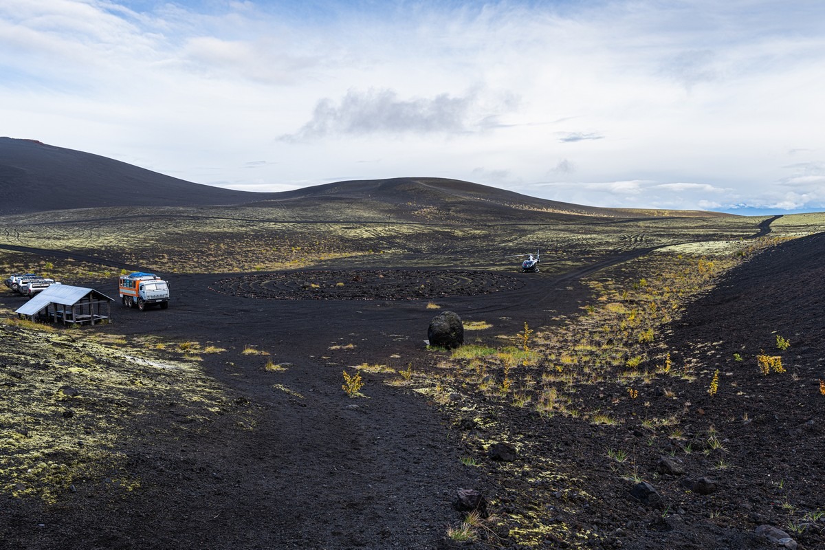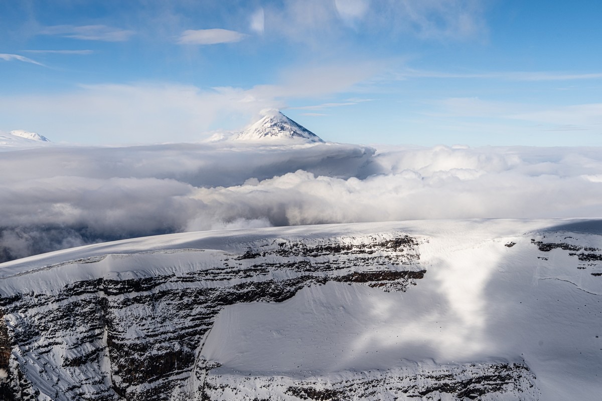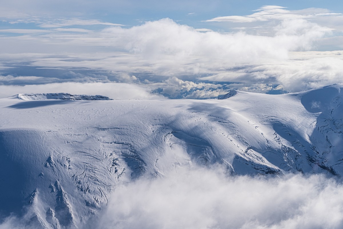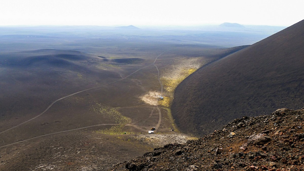 Погоде деваться некуда — когда-то она будет улучшаться. Каждый новый день нашего путешествия развивался именно по такому сценарию. Но сейчас нам показывают однозначно не самые созерцательные картинки. Пролетаем другим близлежащим вулканом Ключевской группы, Толбачиком.
