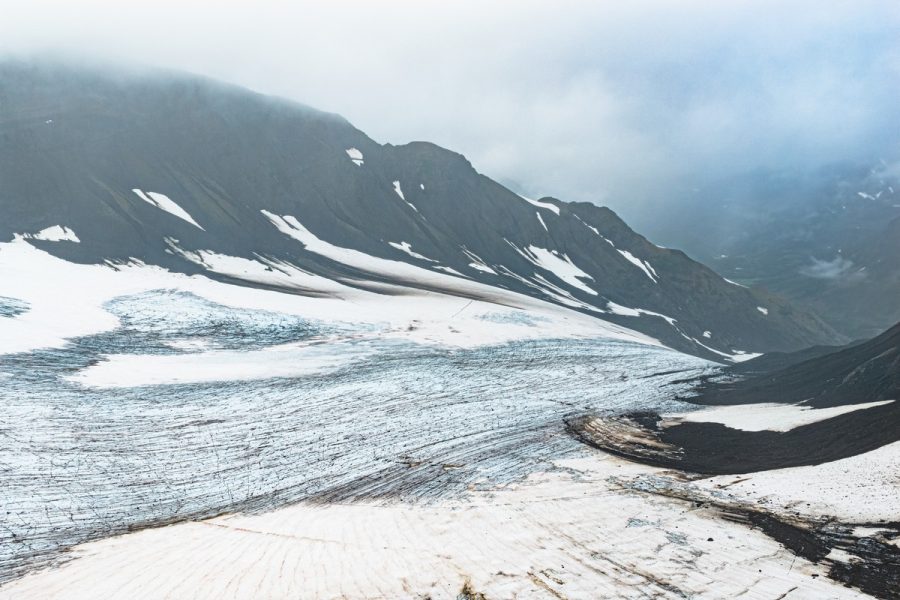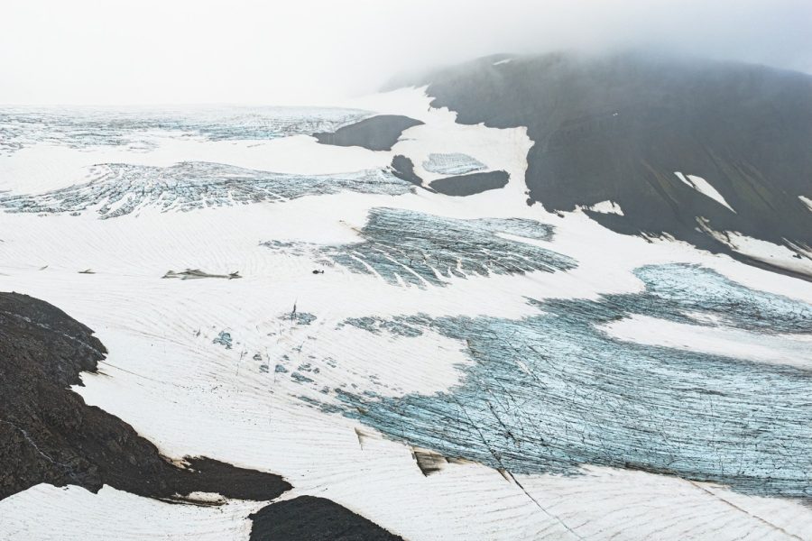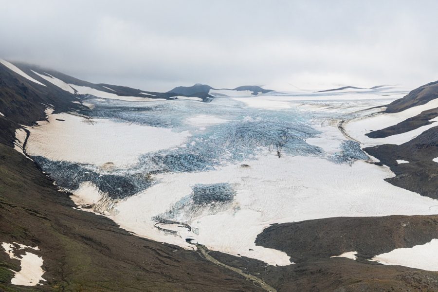 Перед отправлением на юг несмотря на хмуро-пасмурную облачность мы всё же решили сделать короткую вылазку из нашей базы в Тумроках на ледники Кроноцкого полуострова. Я саботировал это мероприятие, поскольку лёд надо смотреть исключительно в солнечную погоду. В туманную хмурь гулять по ледникам — только расстраиваться. Посему все нижеследующие фотки — дело рук гаджетов моих случайных попутчиков.