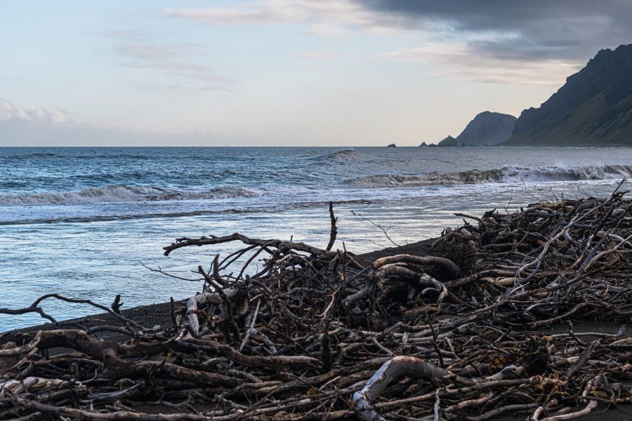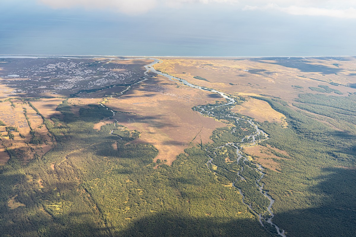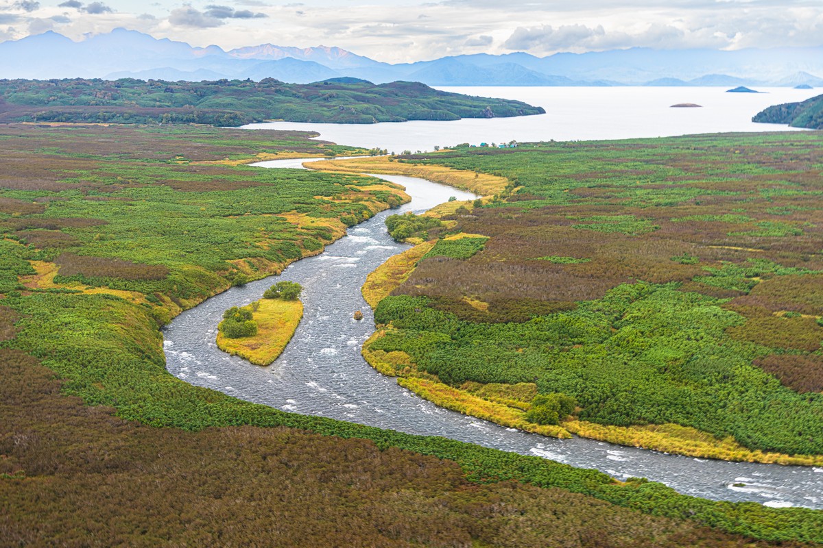 Речка Кроноцкая — не исключение. Сюда тоже приходят огромные стада косяки разнообразных лососей — вооон оттуда с лимана. Да-да, запруда речной воды перед морем-океаном здесь тоже называется лиманом. Вот, если приглядеться, то видна и река и лиман. И океан, само собой.
