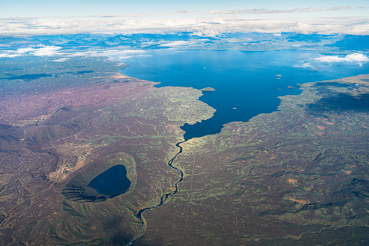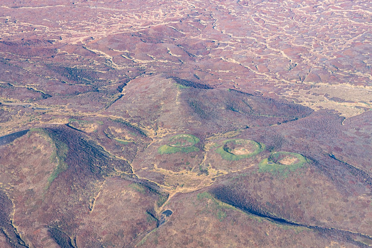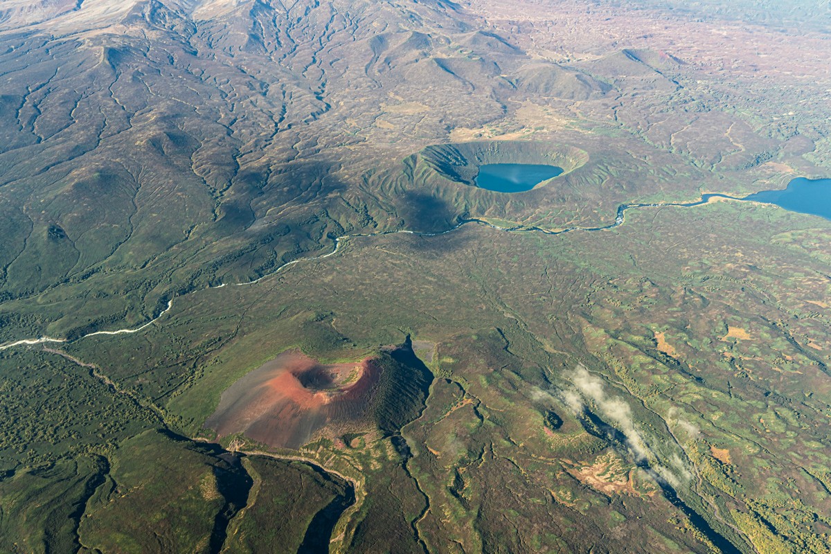 Внизу слева — не просто озеро, а настоящий маар — кратер, образовавшийся в результате взрыва перегретых водяных паров. Происходит такое явление в случаях, когда подземные воды соприкасаются с раскалённой вулканической породой, да под большим давлением. Иногда вода просто высвистывает на поверхность, но бывает и «бабах» — вполне себе размерный взрыв (вот бы это в килотоннах измерить) — и кратер с озером в результате подобных природных событий.