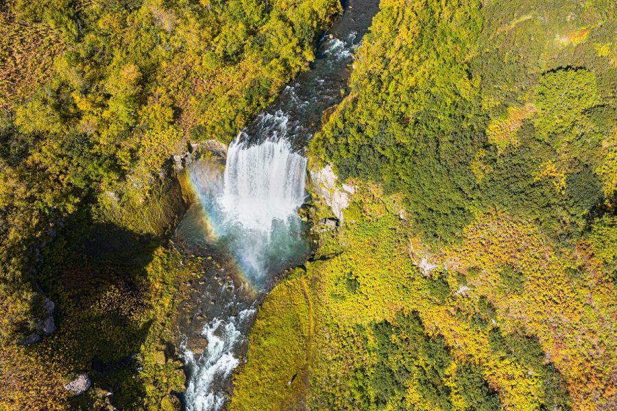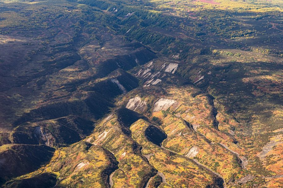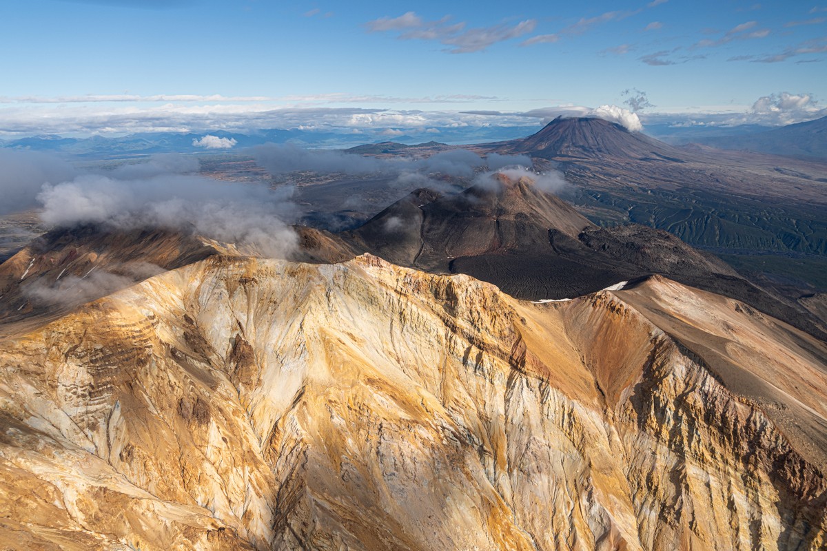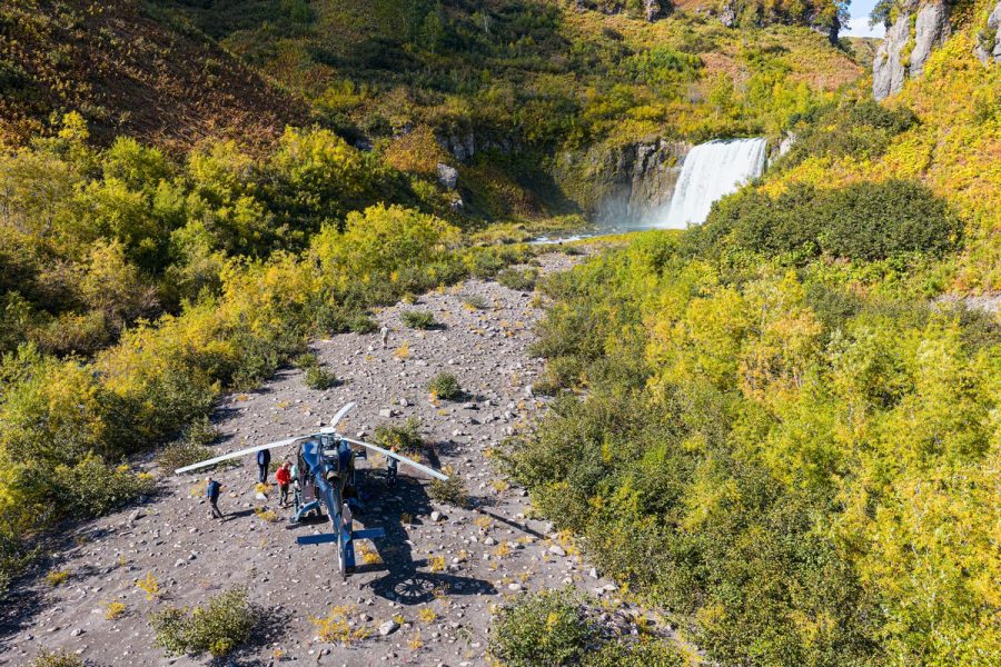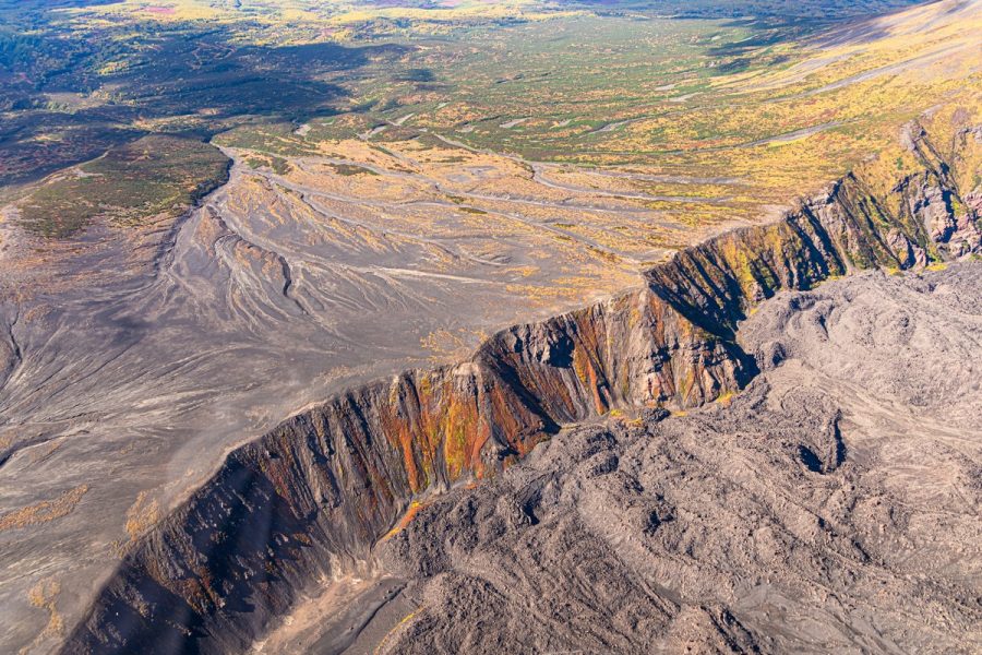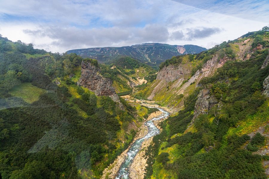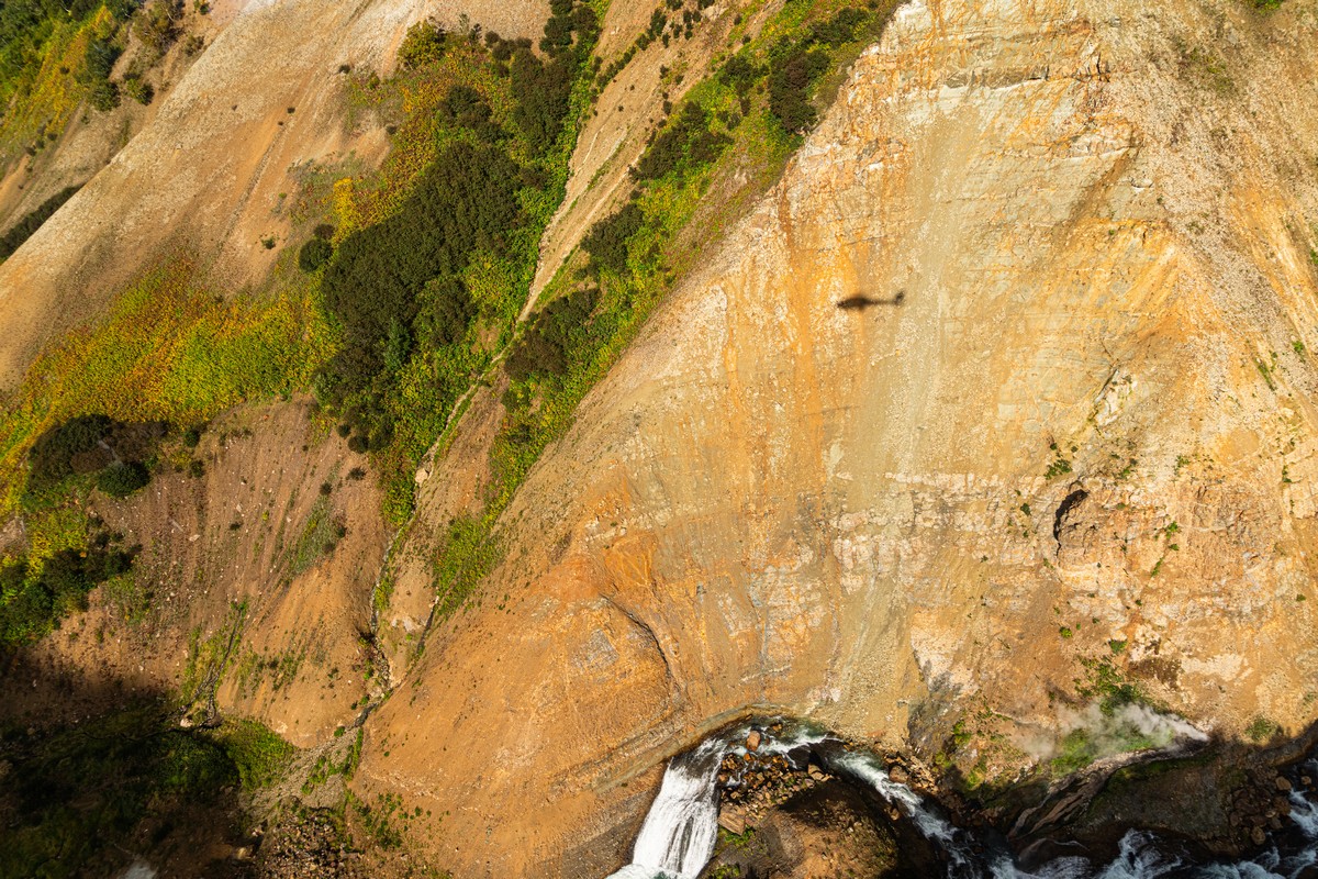 Местные речки проточили целые каньоны в вулканических породах. На Ми-8 по их зигзагам не полетаешь, а на вертолёте размерами поменьше — просто восторг!