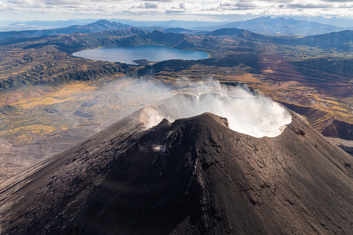 Его кратер постоянно дымится, а иногда даже выкидывает немаленькие столбы вулканического пепла и газа. Вершина вулкана и озеро (само собой тоже Карымское) в старом кратере на заднем плане: