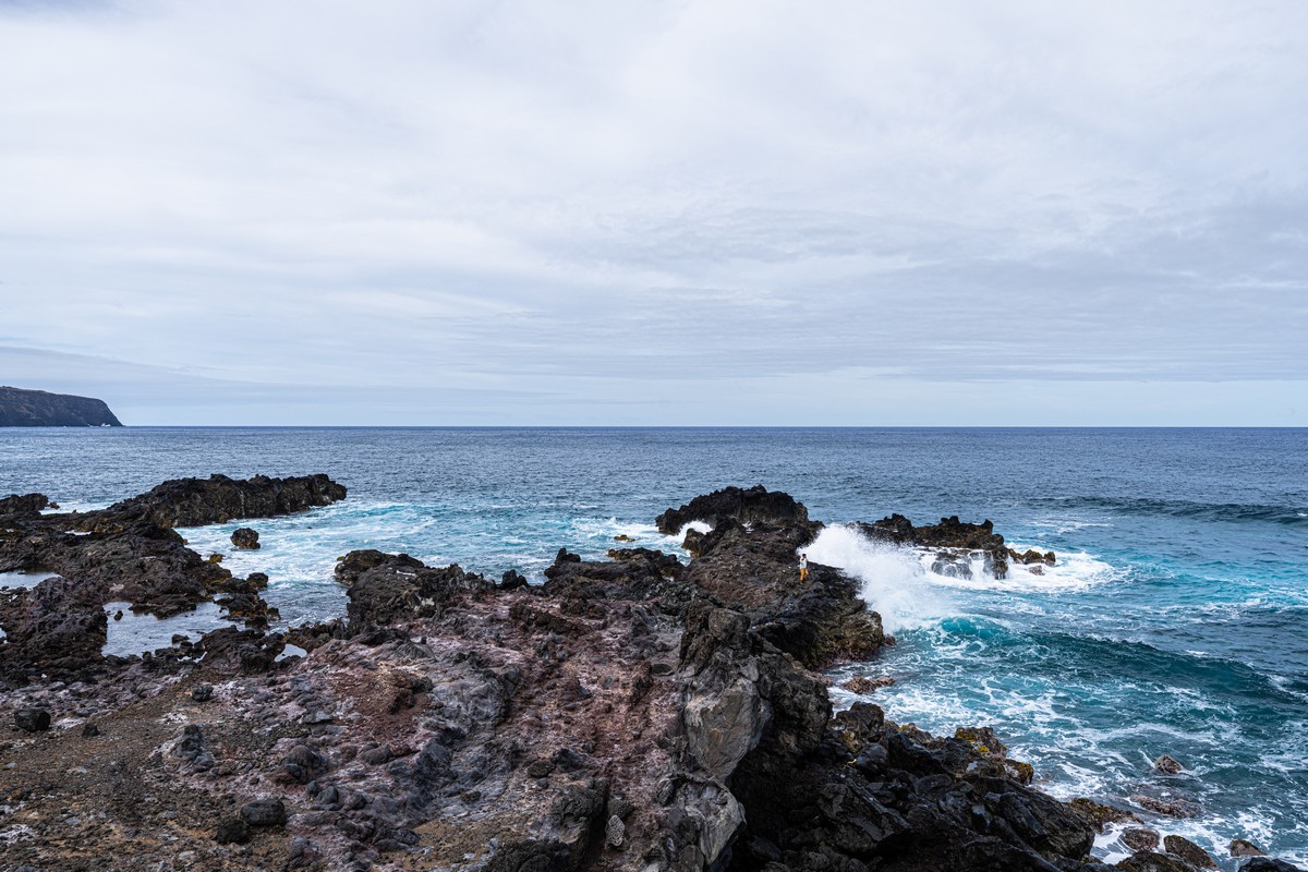 Да-да, мы же на острове. Посему — купаться! Но, увы, здесь в практически везде скальное побережье, чёрные вулканические каменюки омываются океанским прибоем. Но есть одно местечко, где в заливе намыло песчаный пляж!