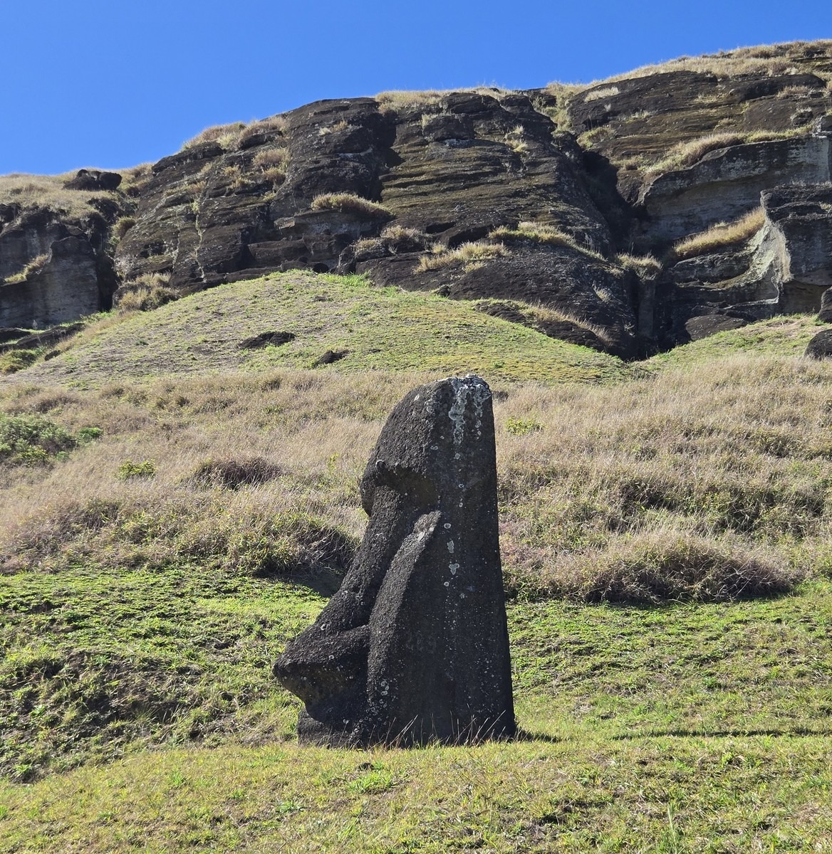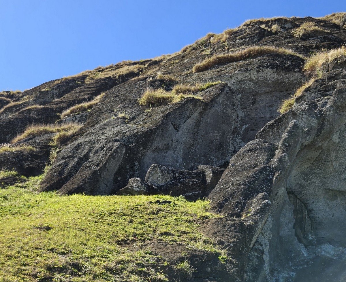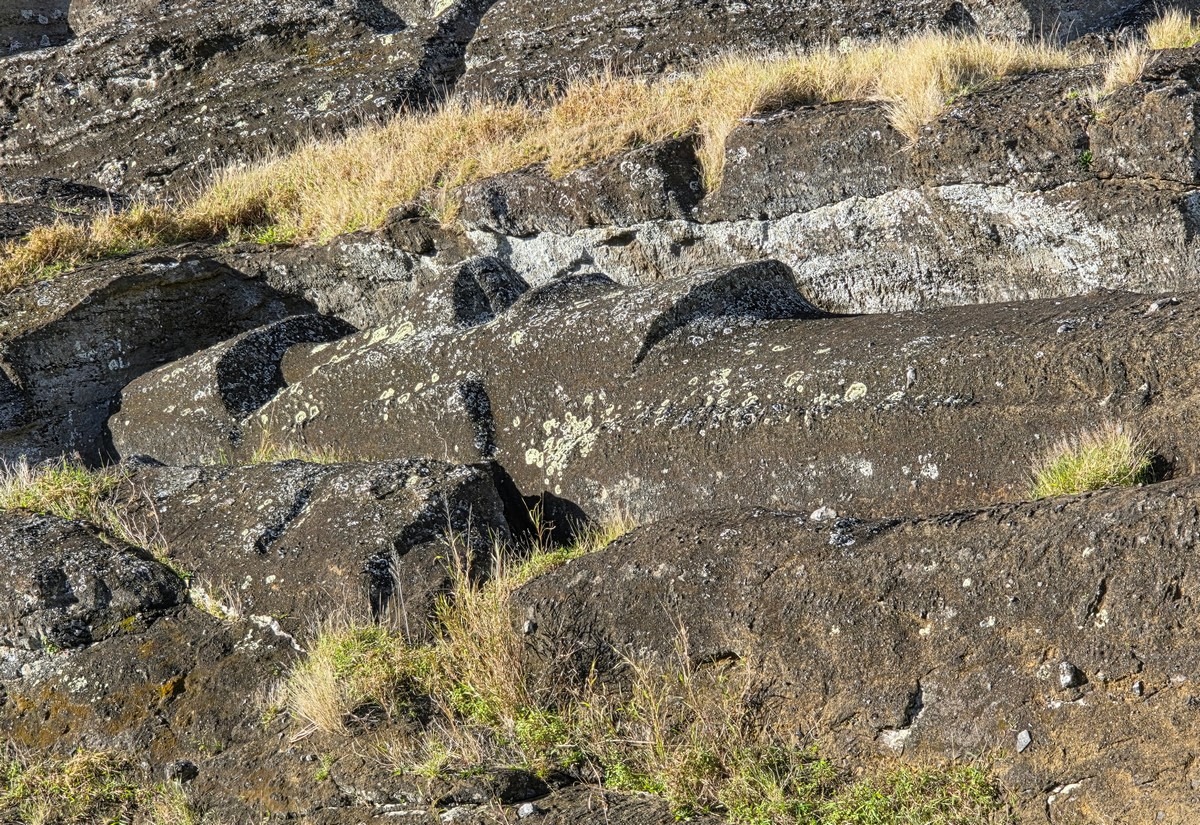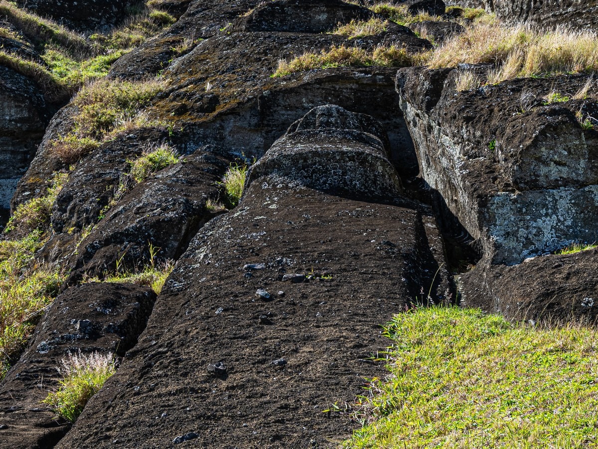 Каменоломни тех давних эпох застыли во времени, нет больше стучащих по грунту каменотёсов. Сгинули снующие туда-сюда прочие рабочие. Испарились в тумане веков внимательно надзирающие за происходящими процессами руководители в ярких одеждах… Или не было ярких одежд? Кто же это знает… Было, сгинуло, забыто. Оставшиеся истуканы стоят и смотрят куда-то, куда их поставили смотреть, а неоконченные до сих пор лежат на склонах вулкана Рано-Рараку. Обветренные и эрозированные, носами вверх, не всегда «читаемые» на склонах вулкана — вот такие. Видите?