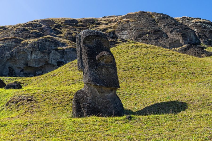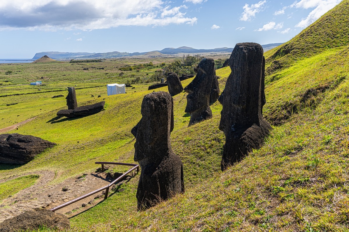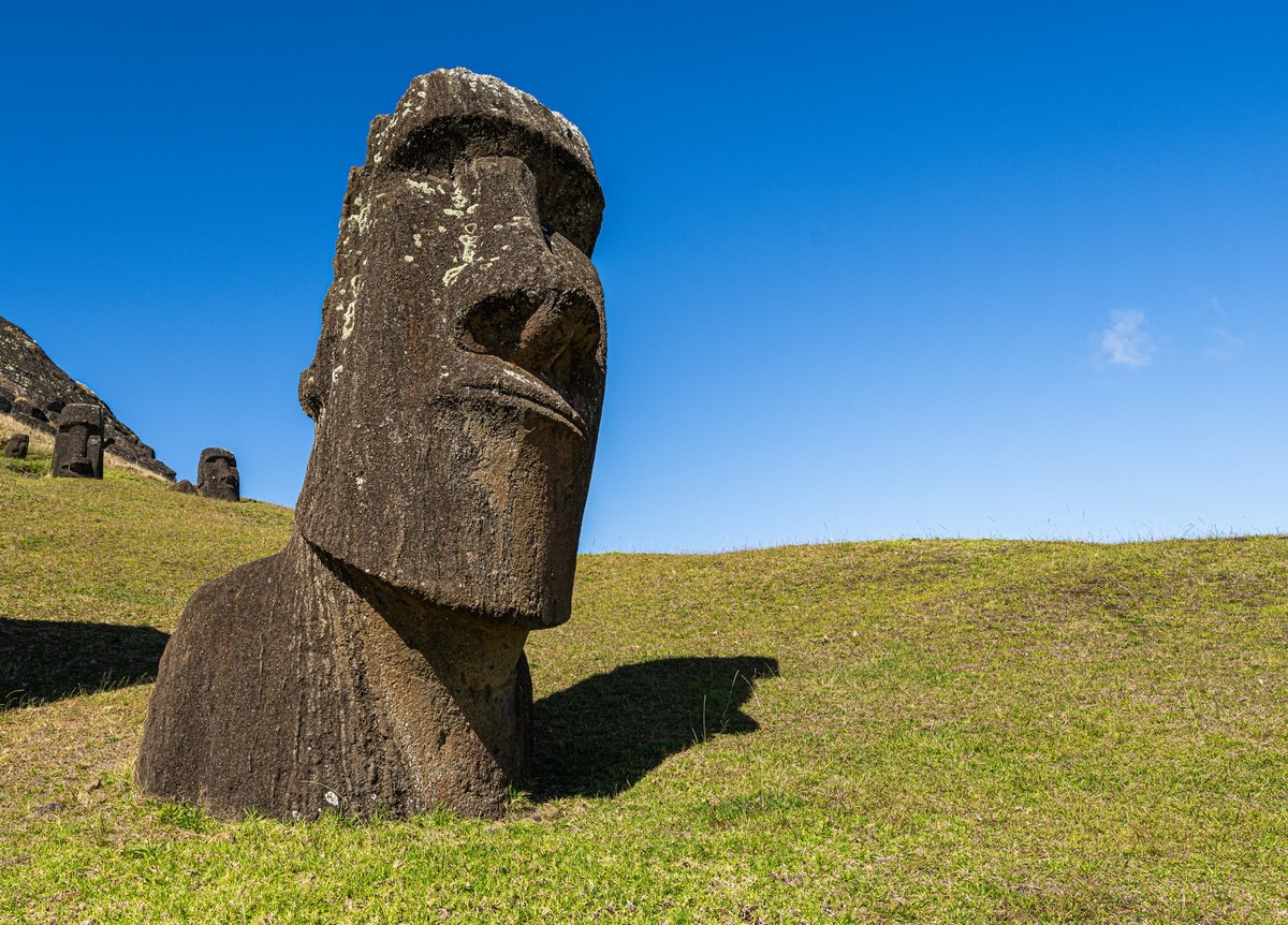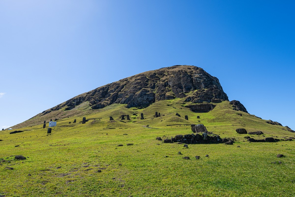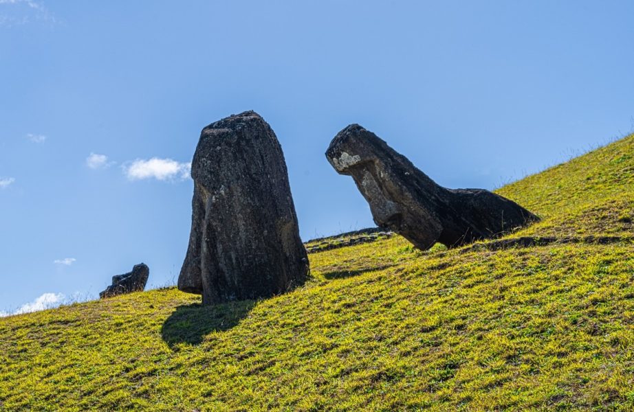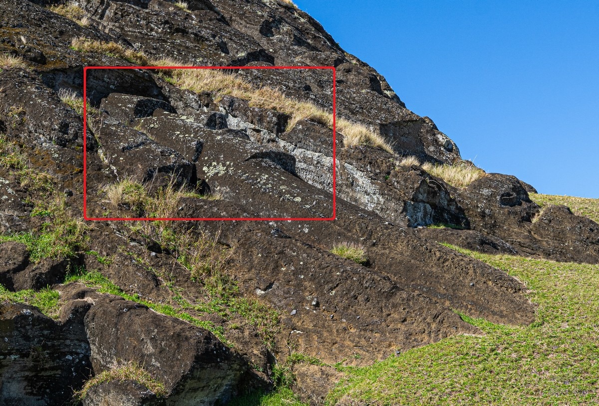 Каменоломни тех давних эпох застыли во времени, нет больше стучащих по грунту каменотёсов. Сгинули снующие туда-сюда прочие рабочие. Испарились в тумане веков внимательно надзирающие за происходящими процессами руководители в ярких одеждах… Или не было ярких одежд? Кто же это знает… Было, сгинуло, забыто. Оставшиеся истуканы стоят и смотрят куда-то, куда их поставили смотреть, а неоконченные до сих пор лежат на склонах вулкана Рано-Рараку. Обветренные и эрозированные, носами вверх, не всегда «читаемые» на склонах вулкана — вот такие. Видите?