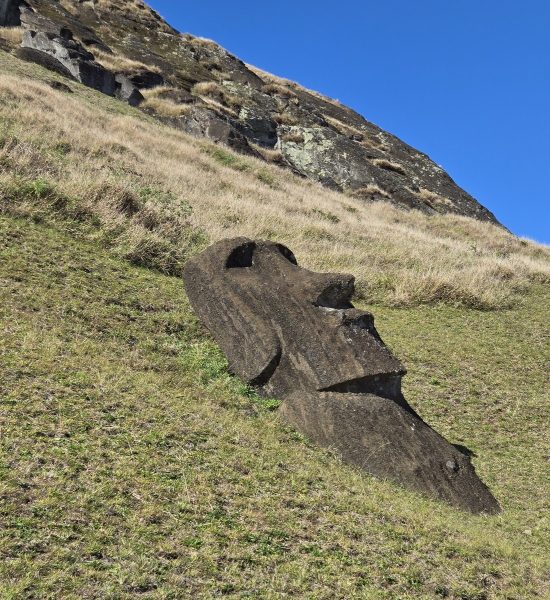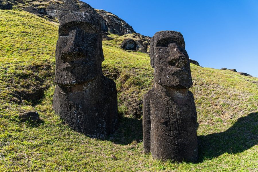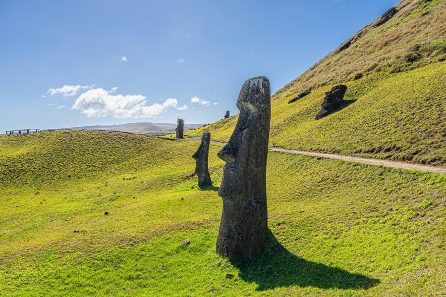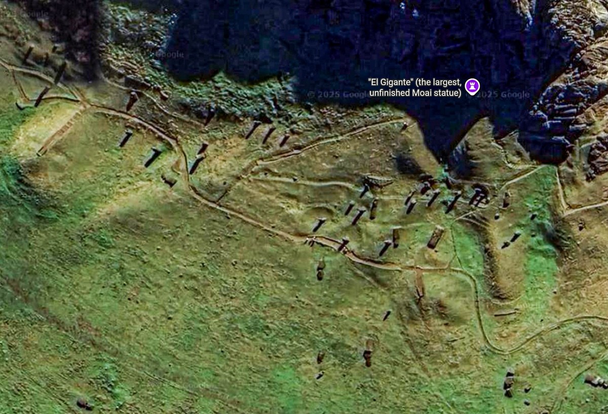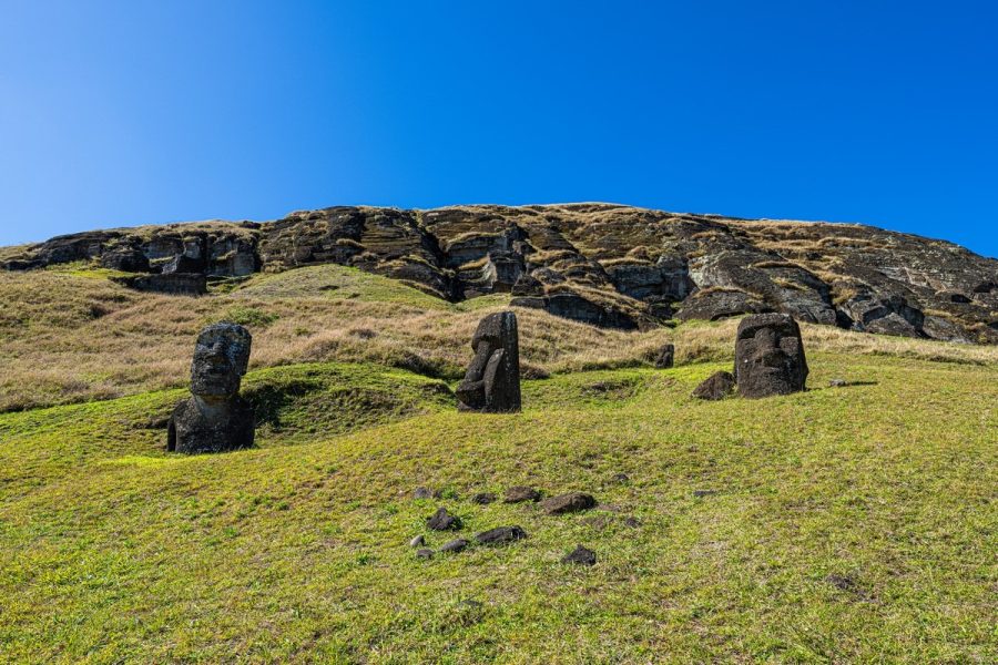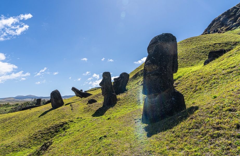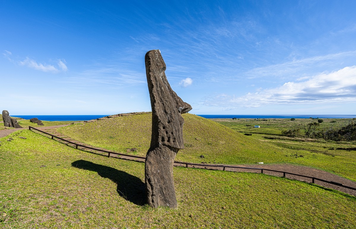 Каменоломни тех давних эпох застыли во времени, нет больше стучащих по грунту каменотёсов. Сгинули снующие туда-сюда прочие рабочие. Испарились в тумане веков внимательно надзирающие за происходящими процессами руководители в ярких одеждах… Или не было ярких одежд? Кто же это знает… Было, сгинуло, забыто. Оставшиеся истуканы стоят и смотрят куда-то, куда их поставили смотреть, а неоконченные до сих пор лежат на склонах вулкана Рано-Рараку. Обветренные и эрозированные, носами вверх, не всегда «читаемые» на склонах вулкана — вот такие. Видите?