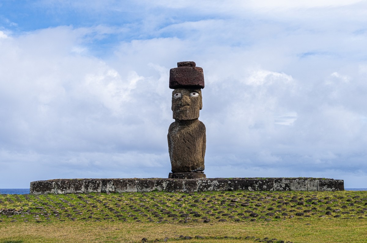 Одна из самых знаменитых моаи — ей восстановили глаза. По рассказам гида, вроде как возле лежащих на земле статуй находили сделанные из пемзы «глаза», но они были в полуразрушенном состоянии. Потому их просто восстановили заново: