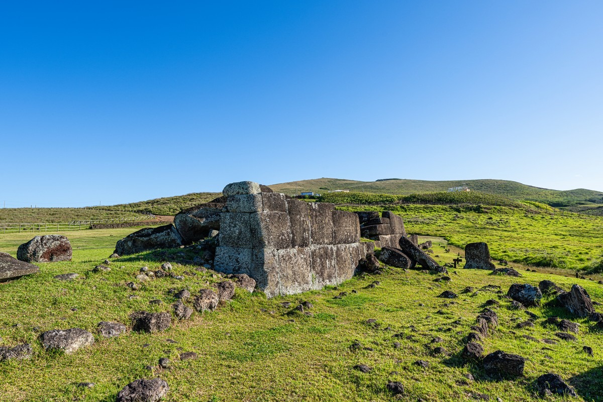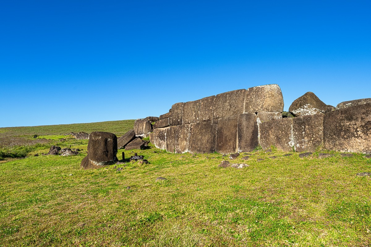 Вот как такое может случиться? Неужели остров был заселён американскими народами? Да, была такая популярная гипотеза: Тур Хейердал даже на плоту «Кон-Тики» по Тихому Океану плавал, чтобы доказать эту версию развития событий. Когда появились генетические исследования, то они подтвердили, что контакты между полинезийцами и жителями севера Южной Америки точно были — как минимум однократно (а наверняка и нет) — образцы ДНК коренных жителей Рапа-Нуи и образцы уникальной для Южной Америки флоры это доказывают. И вот такая стена здесь на острове, в 4 тыс.км от Куско — древней столицы инков.