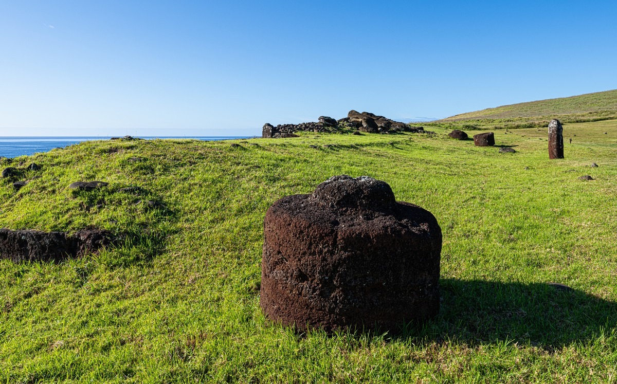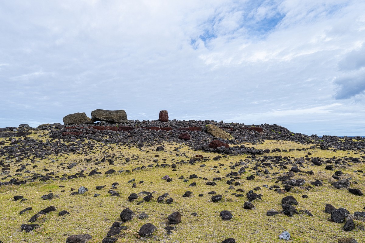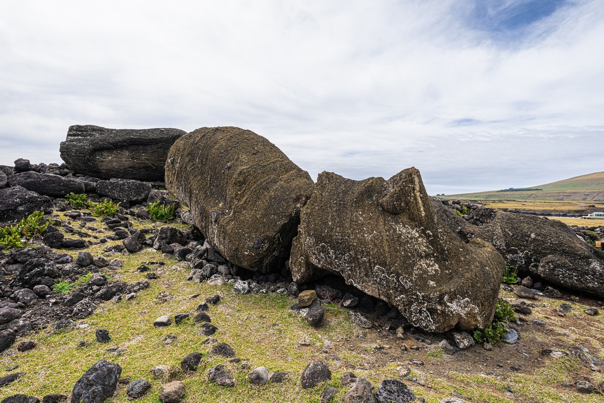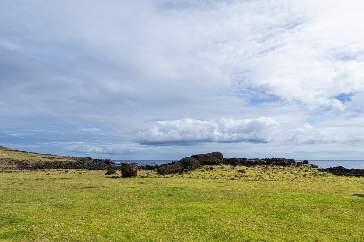 Иногда по дороге попадаются практически полностью разрушенные старые церемониальные платформы-аху. Вот это платформа «Ahu Te Pito Kura», где лежат остатки самой большой по размеру статуи-моаи, которую успешно доставили из каменоломни. Высота её около 10 метров, а вес разные источники оценивают по-разному — от 10 до 80 тонн: