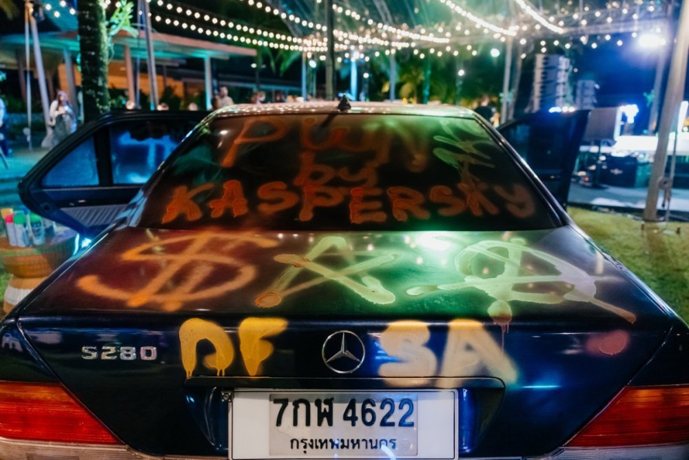 Кстати, а что же стало со стареньким мерседесом — жертвой конференции? Его потом откатили к нам на гала-ужин, где развеселённому народу раздали баллончики с краской — и они ухандокали агрегат до полной неузнаваемости.
