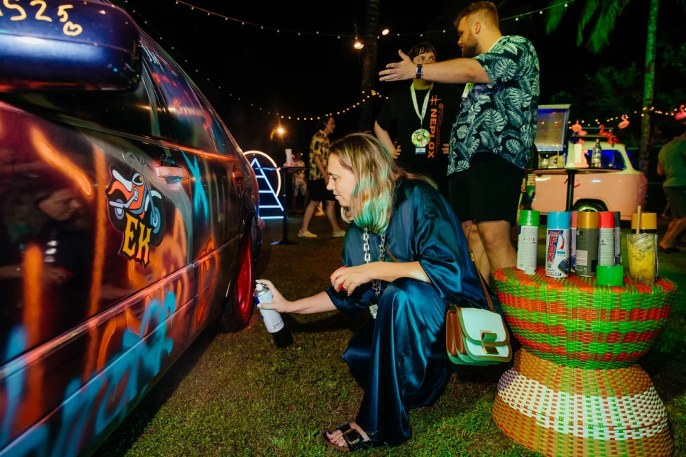 Один баллончик с краской предложили и мне… Но я отказался. Решил судьбу иначе. Если машинка наша, да ещё вот так раскрашенная — то почему бы не прокатиться?