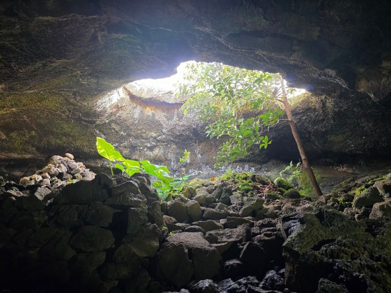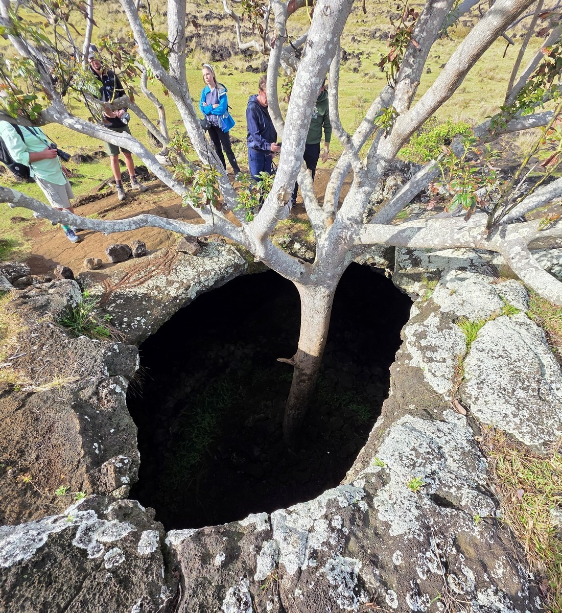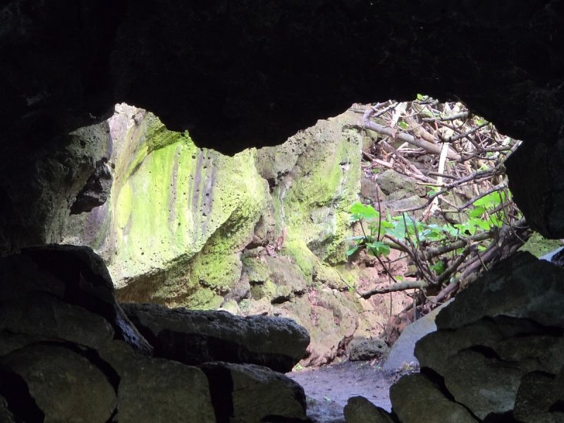 Вокруг — лавовые поля, слегка заросшие травой и дохлым кустарником. А из лавового туннеля торчит дерево!