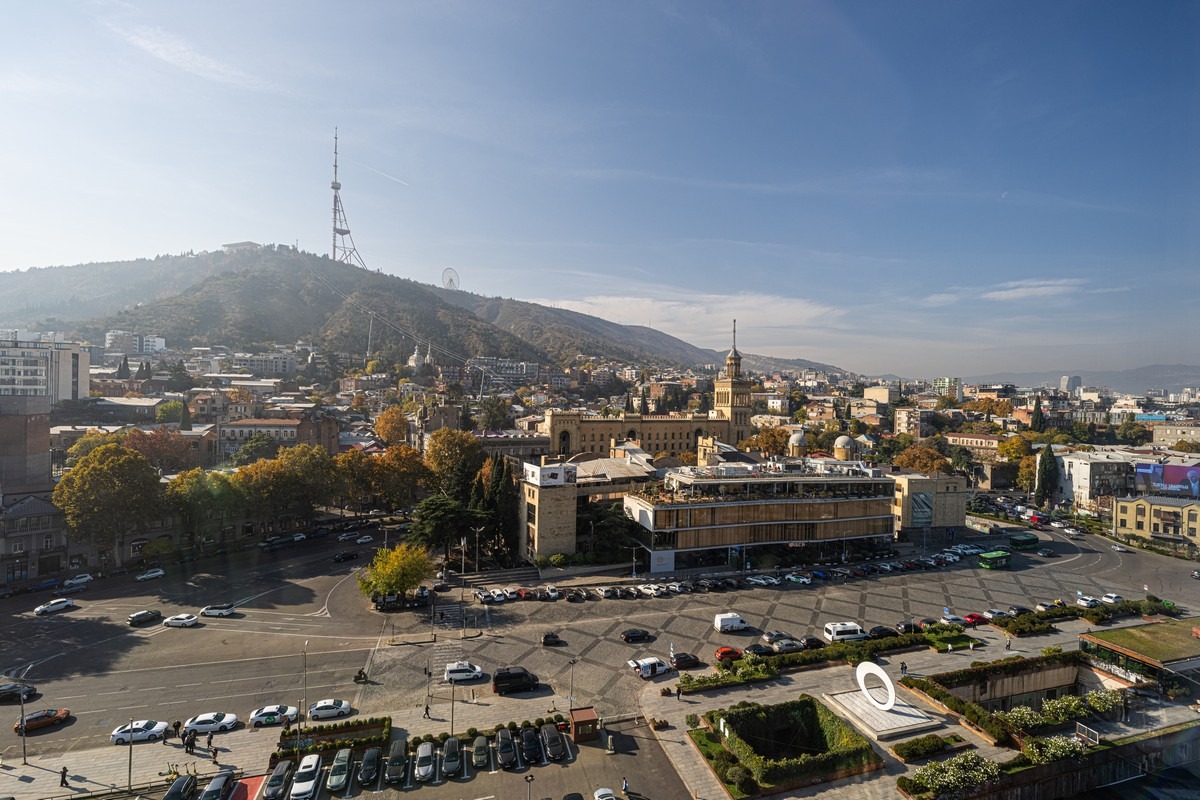Но почему провода натянуты перед одним из главных символов Грузии? Как так граффити на постаменте? Да ещё и парковку такси воткнули для пущего эффекта. Как так?