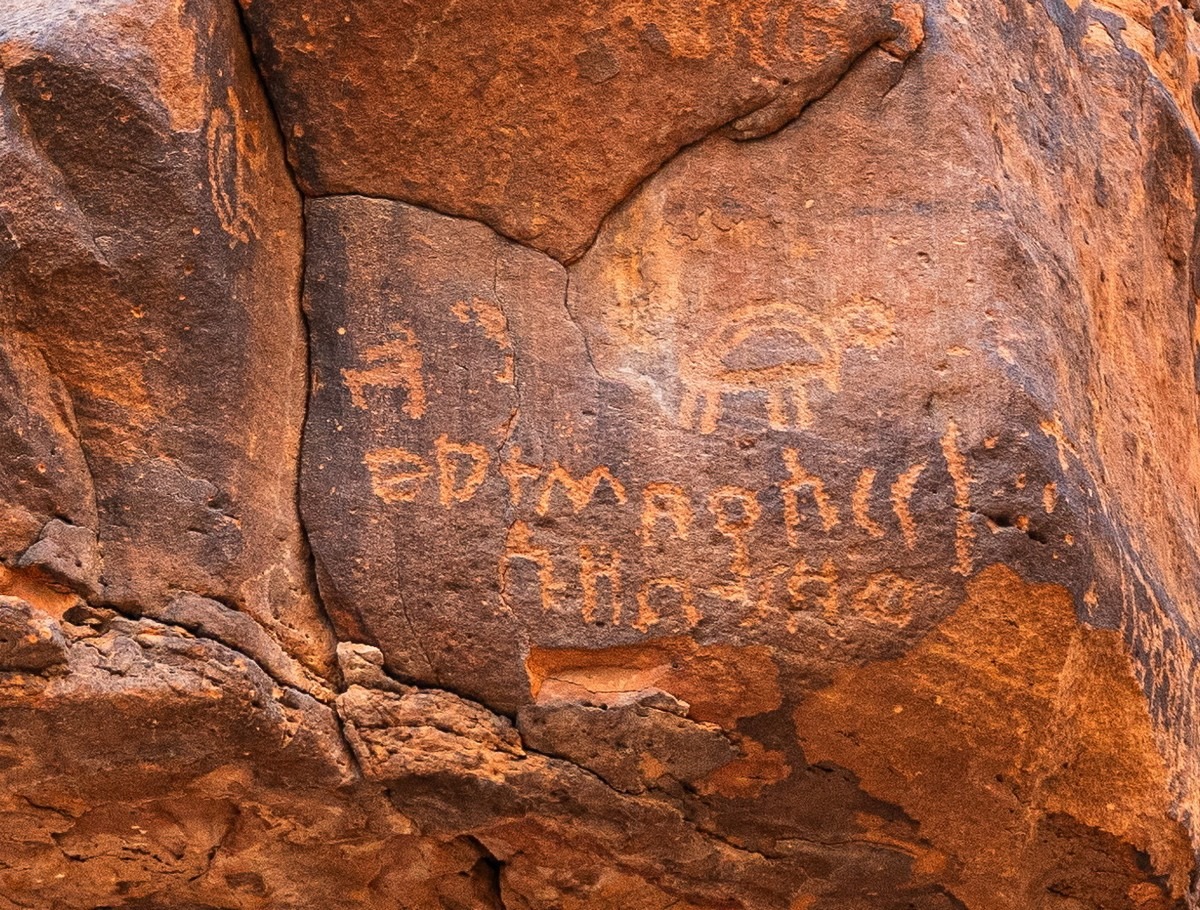 Какие-то надписи, верблюды выцарапаны. Сколько лет этим картинкам — неведомо.