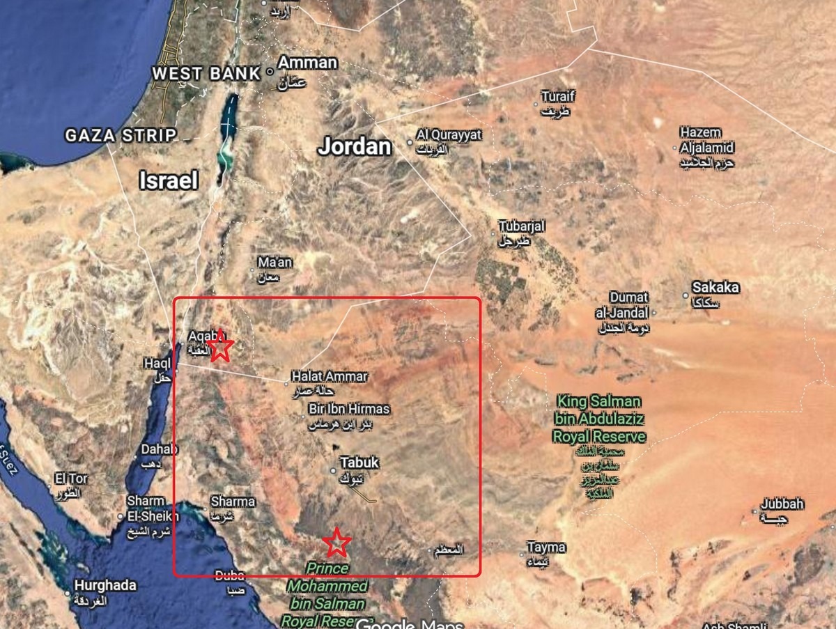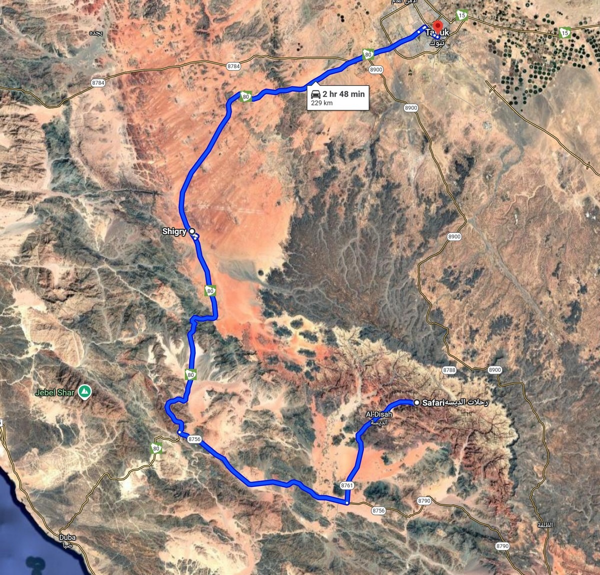 Где это всё находится? А вон там, на северо-западе королевства, почти на границе с Иорданией и недалеко от Красного моря, на карте вот тут (красным также выделен Эр-Рияд, столица КСА) ->