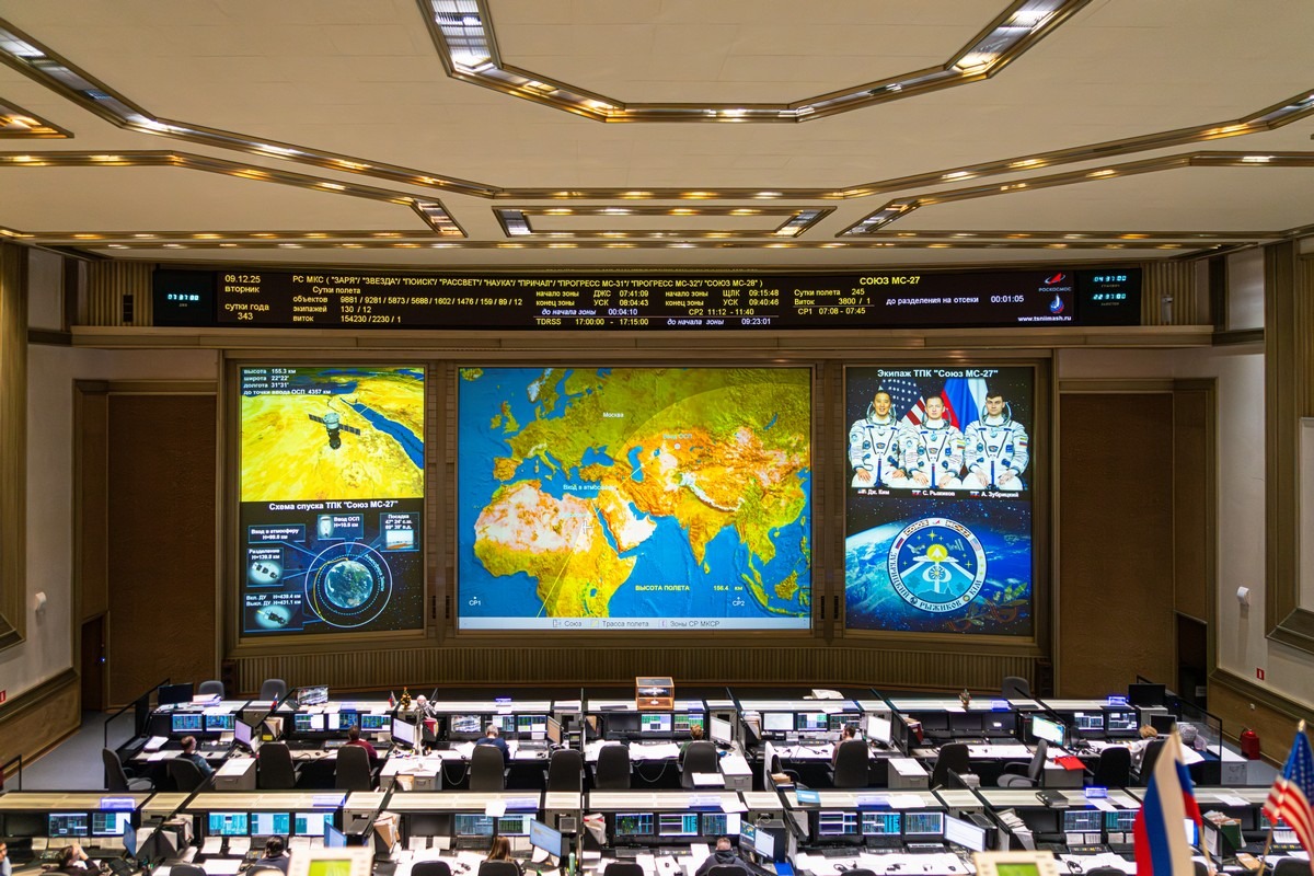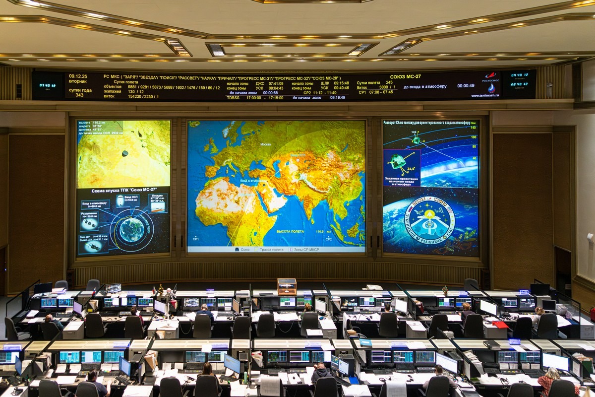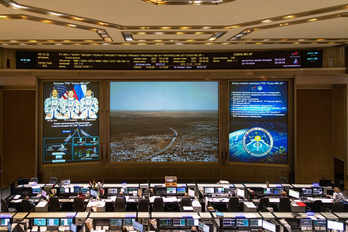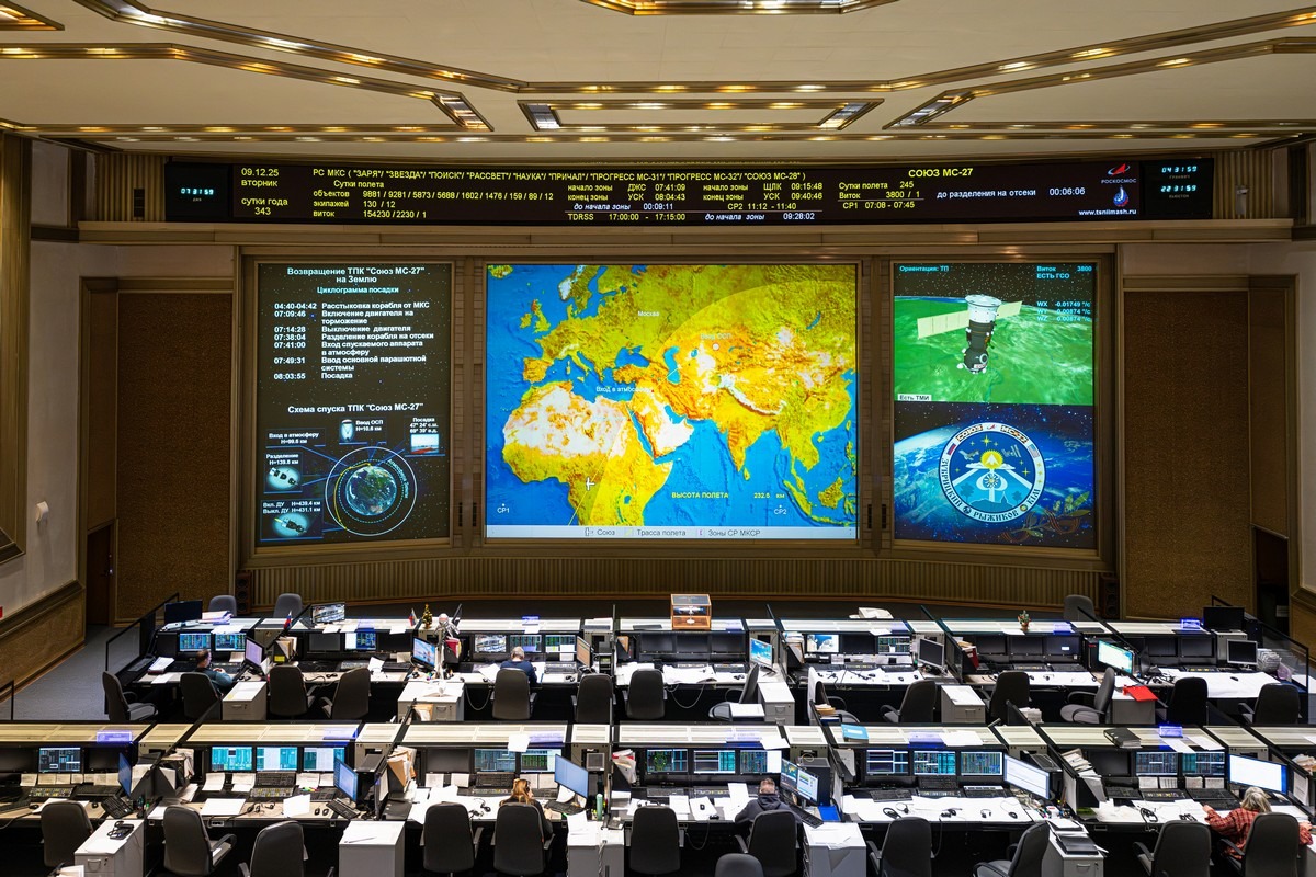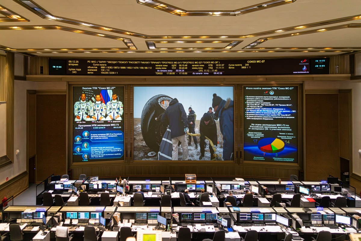 Мне сегодня утром повезло лично наблюдать за посадкой спускаемого аппарата Союз-27 из Центра управления полётами (ЦУП), что в подмосковном городе Королёв. Весьма интересное событие! На удивление: фотки разрешены, пресса на балконе — прямые репортажи ведут. И с балкона всё это смотрится вот так: