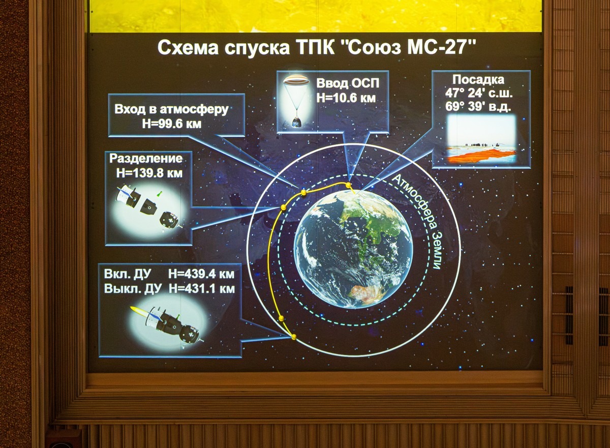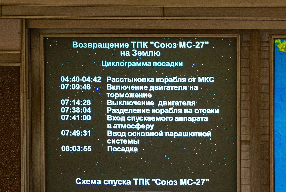 Запуски и спуски космических аппаратов, особенно пилотируемых, достаточно длительный процесс. При посадке космонавты закрывают люки за 3+ часа до расстыковки (за 6 часов 40+ минут до самой посадки), расстыковка с МКС происходит примерно за 2:30 до начала торможения, а от начала торможения до касания поверхности Земли проходит чуть меньше часа.