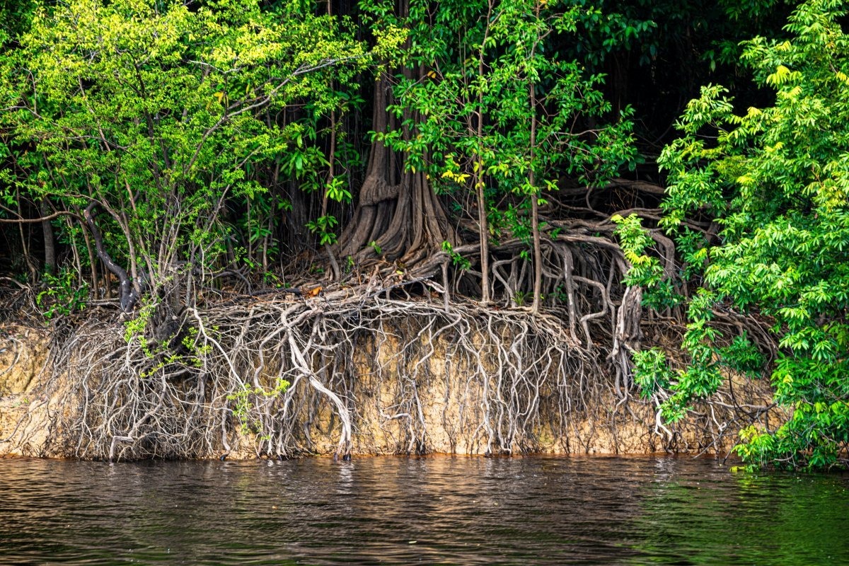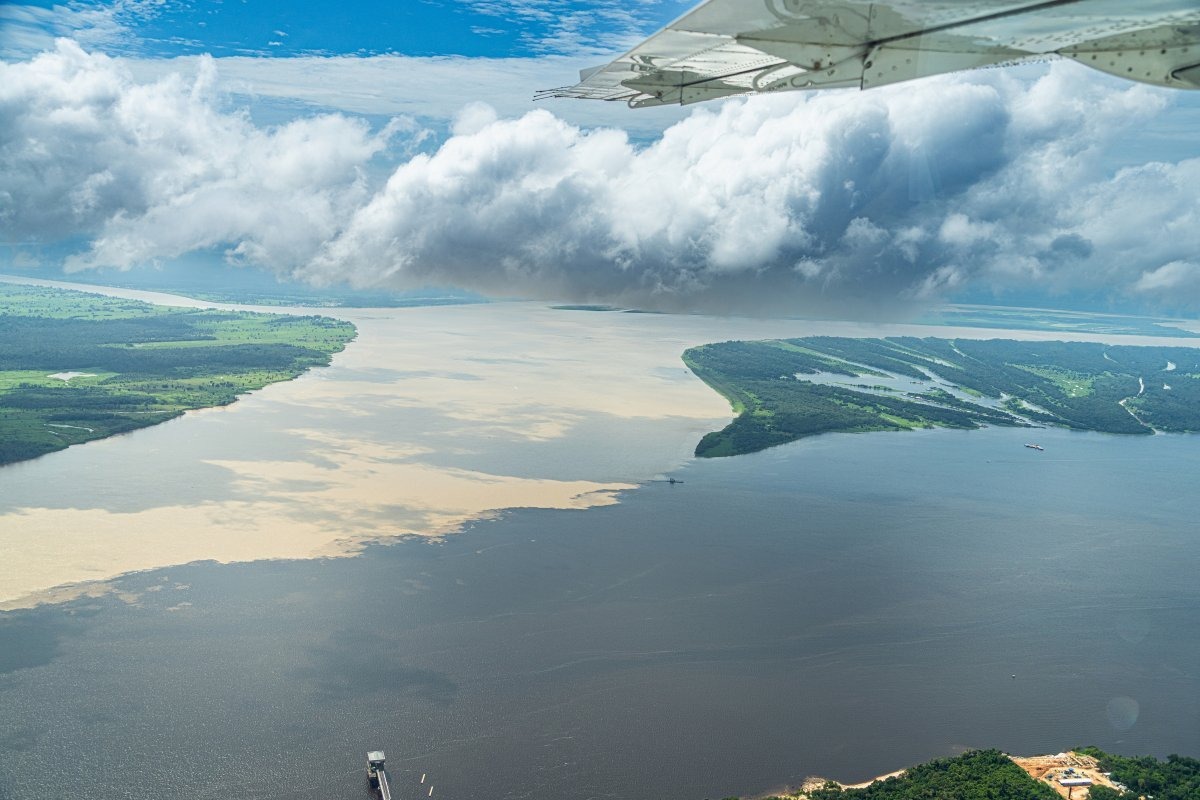 Слияние мутных вод Амазонки и чёрного цвета Риу-Негру (что дословно «Чёрная река»).