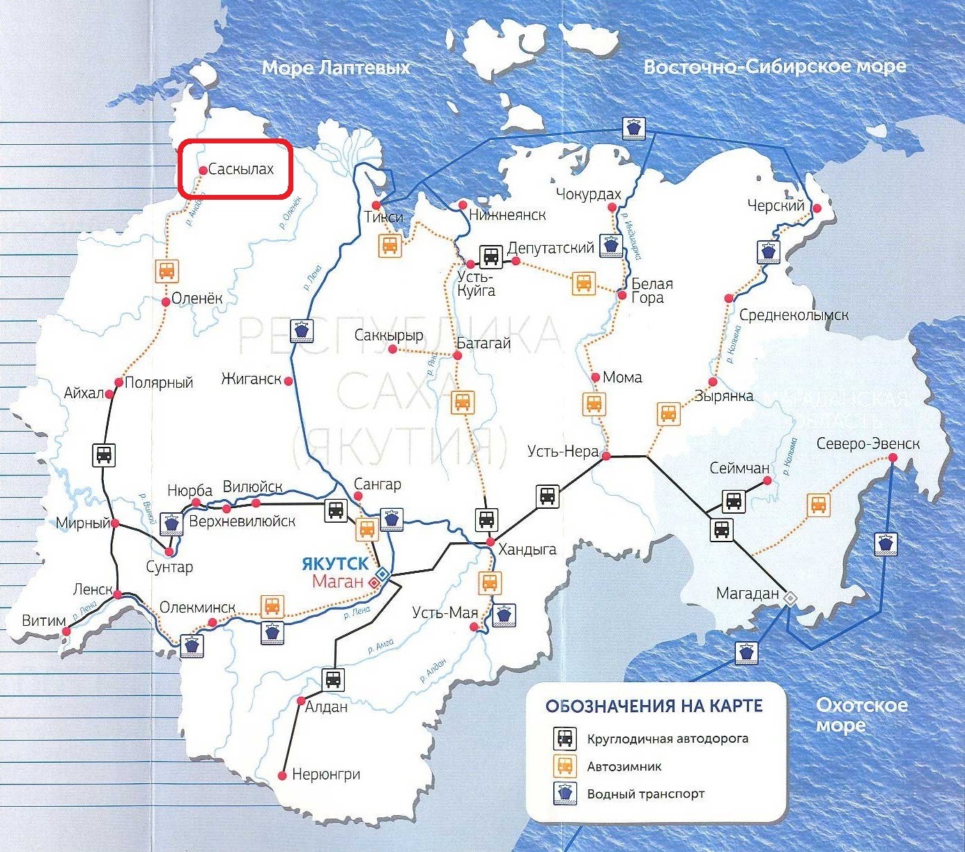 Глядя на карту, очевидно, что вариантов, куда ехать из Мирного, не так много. Можно было бы подумать, что цель нашего путешествия – Саскылах, например, но это не так. А, кстати, удивитесь вы – а где находится этот самый Саскылах? – А вот здесь: