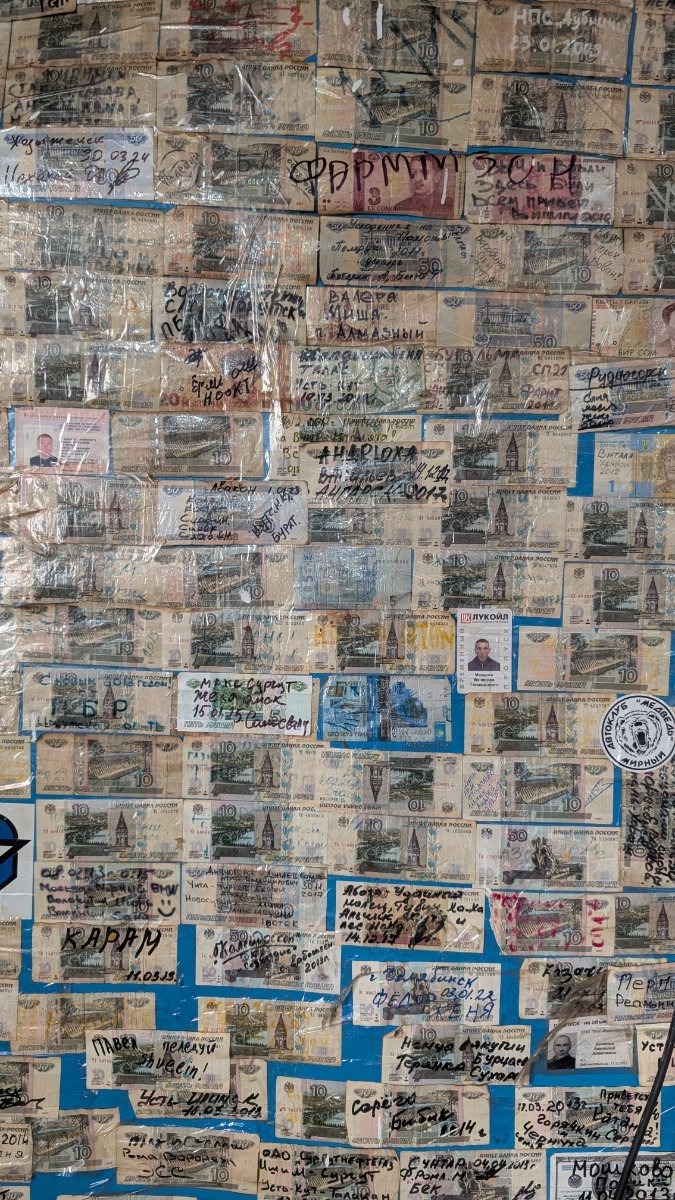 На все 840 км зимника есть один единственный (!) населённый пункт: эвенкийское (?) село Непа. Попадаются «пикеты» – так называют придорожные кафе, которые работают только на сезон зимника, потом там обычно никого нет. Вот стена в одном таком пикете от случайного попутчика А.И.: