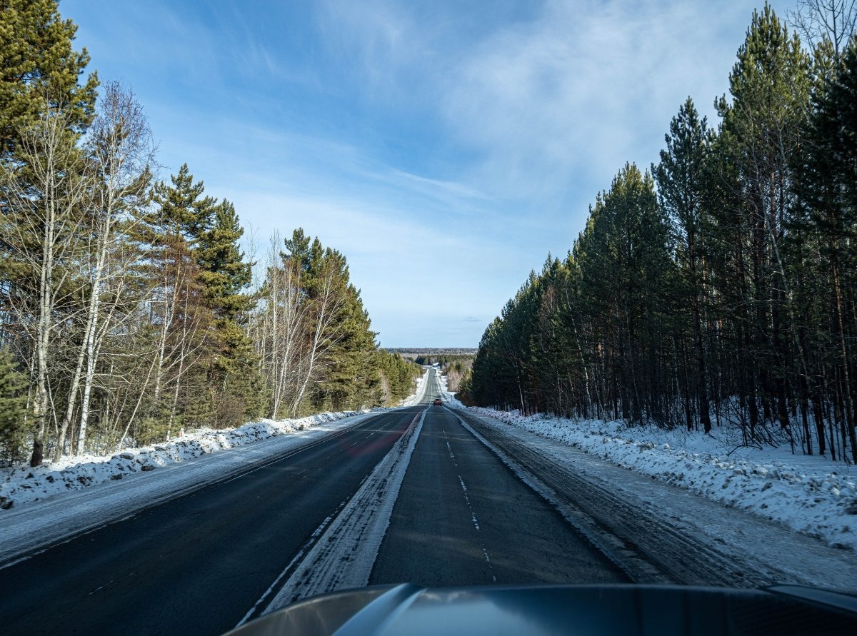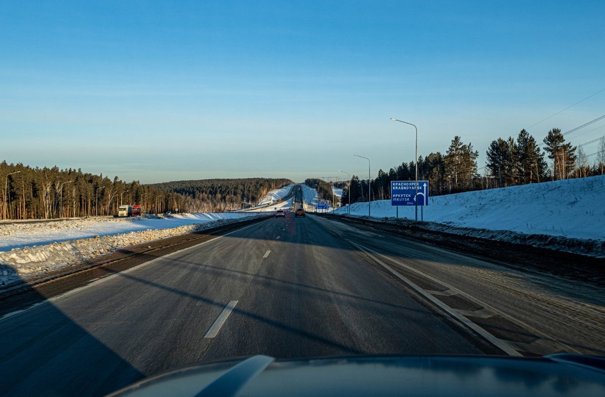Такую красивую дорогу от Иркутска на запад протянули уже километров на 90! В прошлый раз (в 2021-м) такой не было… А дальше мы с неё свернули на север – и дорожка там тоже неплохая. А именно на повороте в Тулуне начинается самая длинная федеральная трасса России «Вилюй«.