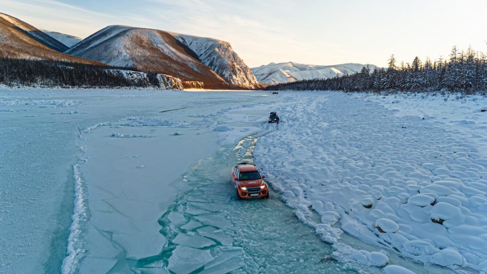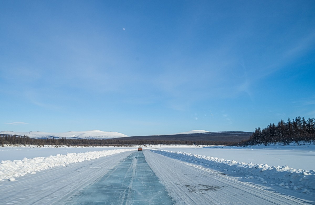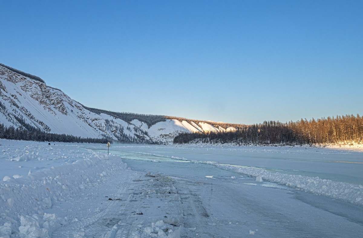 За толщину льда не волнуйтесь, зимой здесь реки промерзают иногда до самого дна, толщина льда бывает больше метра — и лёд выдерживает фуры с многотонными грузами. «Гражданским» автомобилям провалиться под лёд практически невозможно. Так что ровный лёд — это местный автобан.