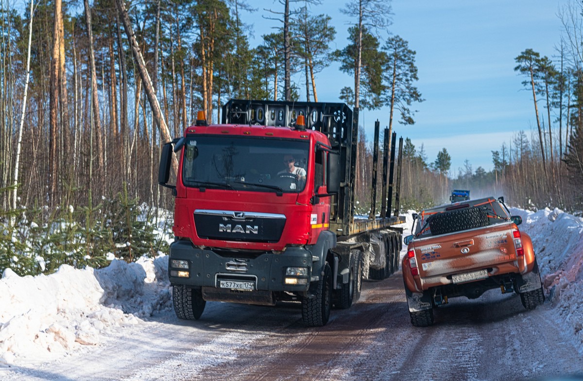 Что ещё. Зимник — не самая широкая дорога, да плюс по сторонам не обочины, а снежные брустверы. Со встречками расходимся аккуратно, уступая им дорогу. Иногда даже останавливаемся, особенно если встречка идёт на север, тяжело гружёная: