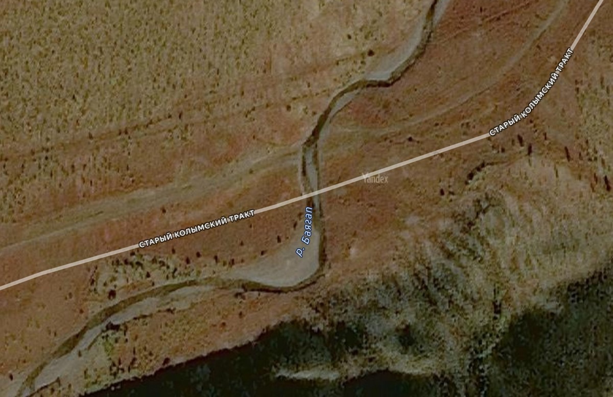 В результате мы добрались до пересечения трассы с рекой Баягап (здесь на яндокартах) — именно здесь и застрял наш лидер: